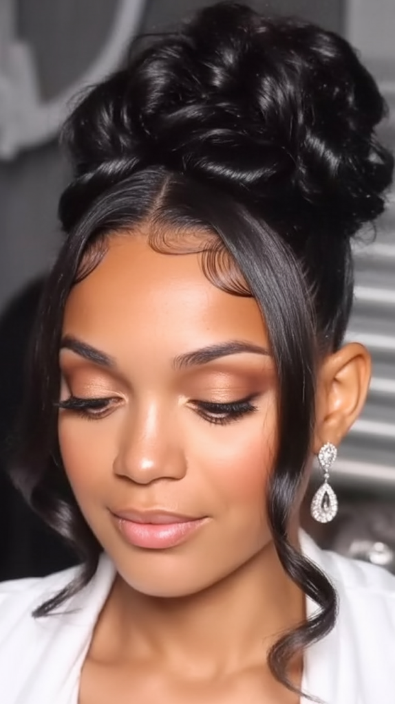 This bun is perfect for brides with long hair or thick, dark hair, as it adds volume, making it look so dramatic. This hairstyle is particularly good for weddings that are either evening weddings or formal weddings, making it another popular wedding hairstyle that will impress brides in 2026. The hairstyle can also include added accessories like a veil or a pair of bold earrings.