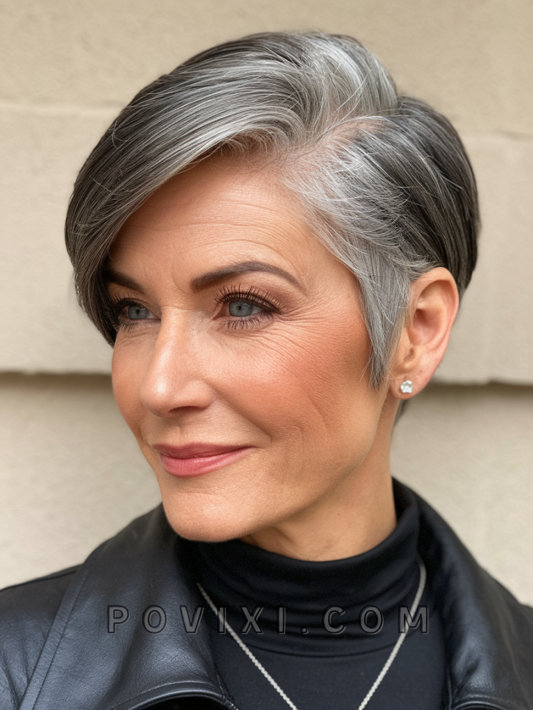For those with straight gray hair, a sleek pixie cut offers a polished, refined look. This style is ideal for professional settings or formal events, where you need to maintain a sophisticated appearance. It works well for women with thin hair, as the sleekness creates the illusion of fullness. The clean lines of the cut complement round or oval face shapes, and it looks particularly striking on women with blue or green eyes.