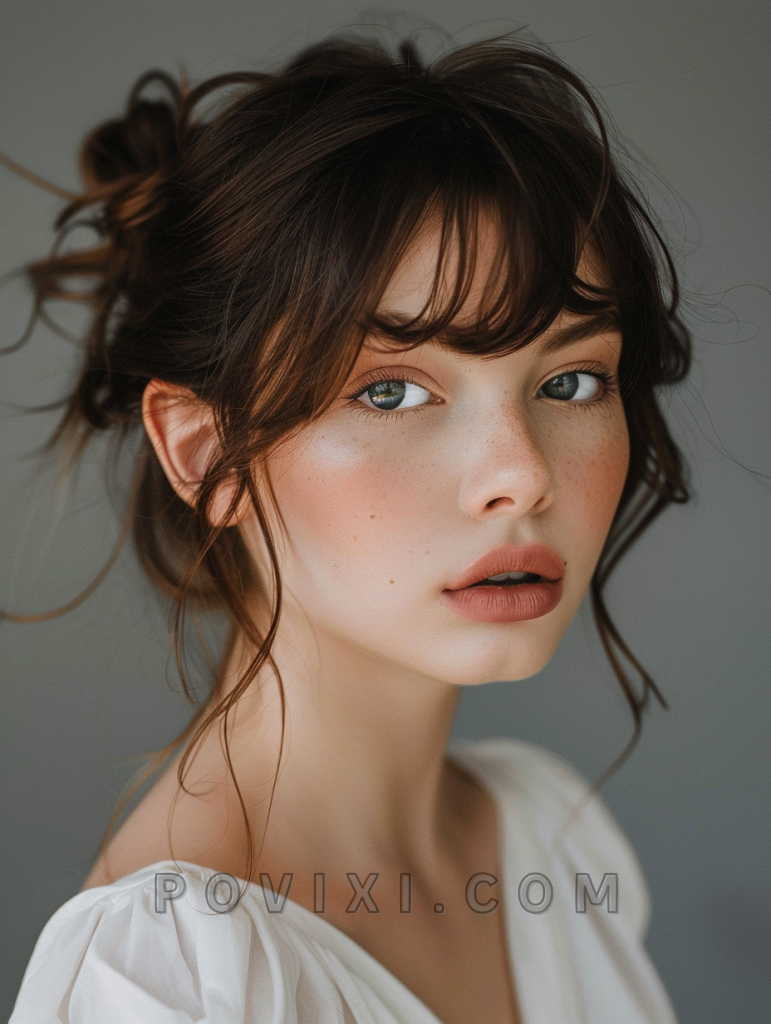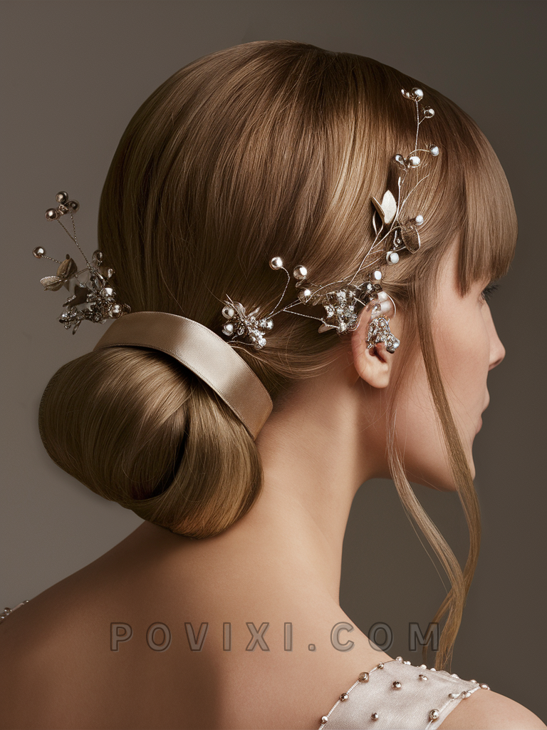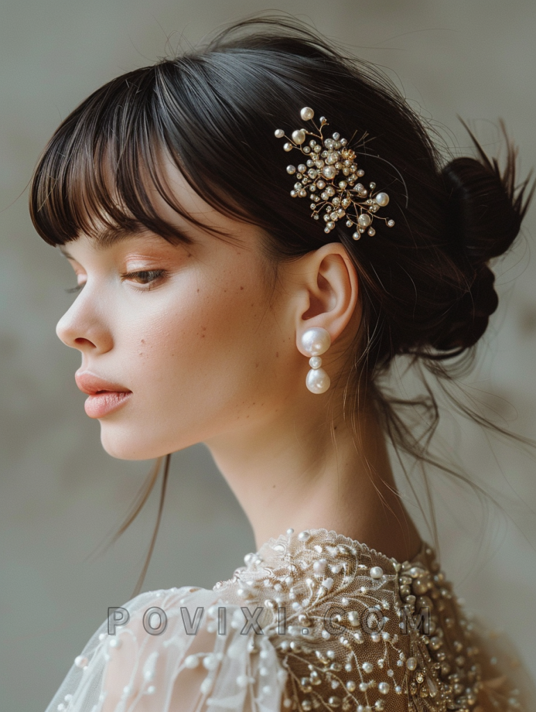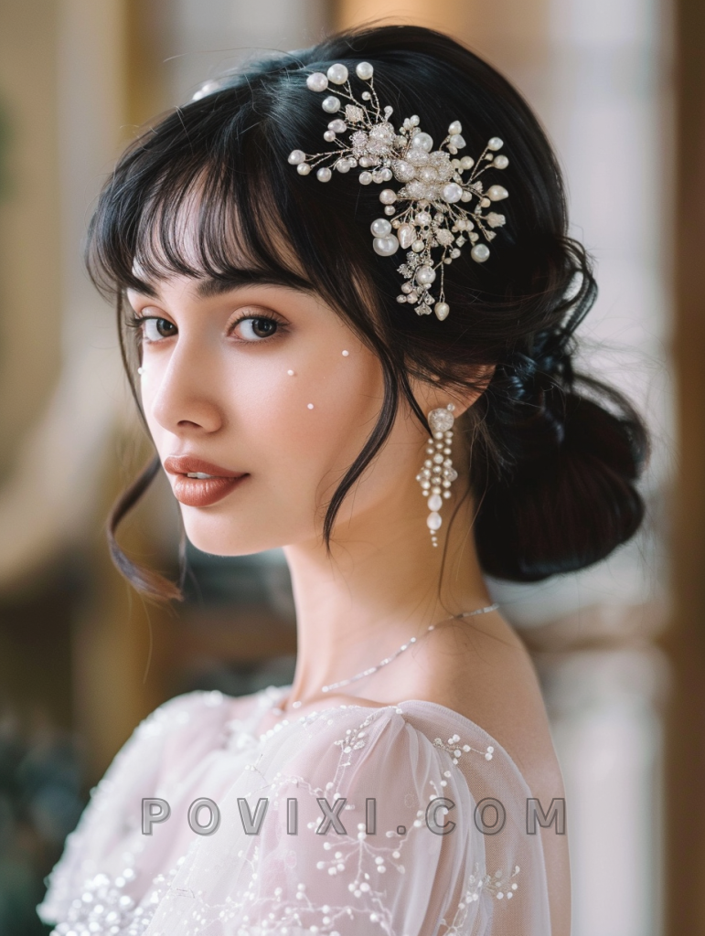 Adding a touch of elegance, the low bun with bangs and pearl accessories is a sophisticated choice for formal events. This hairstyle features a low bun with bangs, adorned with delicate pearl pins or a pearl headband. The pearls add a classic, timeless element, making this style perfect for weddings, bridal showers, or any formal gathering. It suits all face shapes and adds a luxurious touch to the overall look.