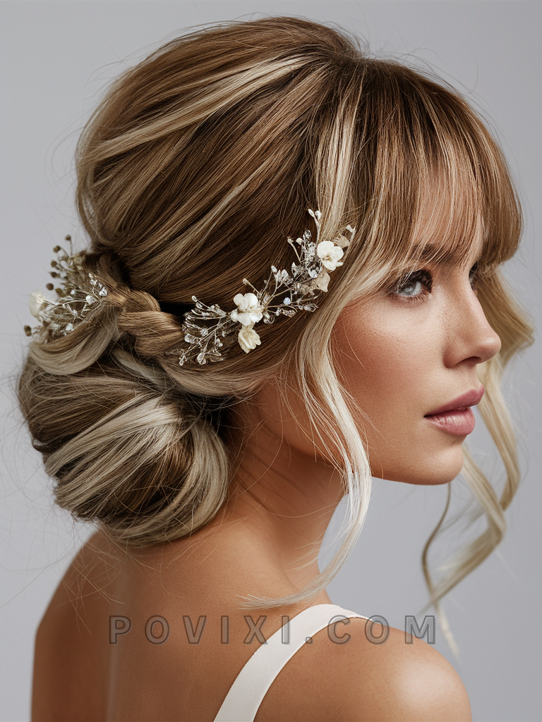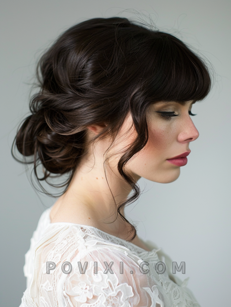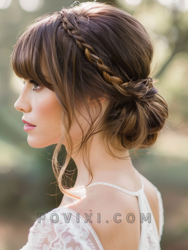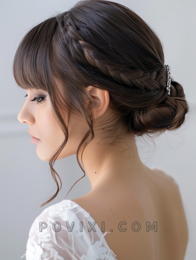 Combining elegance with a touch of bohemian flair, the low bun with side-swept bangs and braided accents is perfect for outdoor weddings or garden parties. This style features a loose bun with intricate braids incorporated into the hairstyle, along with soft side-swept bangs. The braids add an interesting texture and detail, making it suitable for various occasions. This look is particularly flattering for heart and diamond face shapes, as the side-swept bangs help to soften the forehead and emphasize the cheekbones.