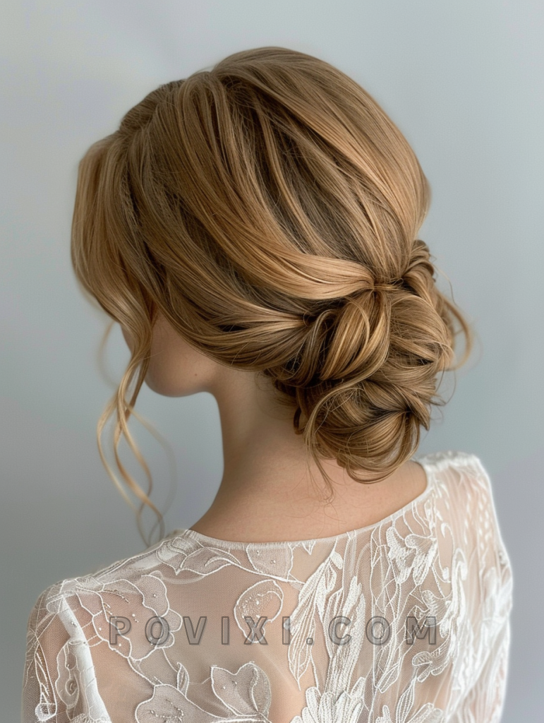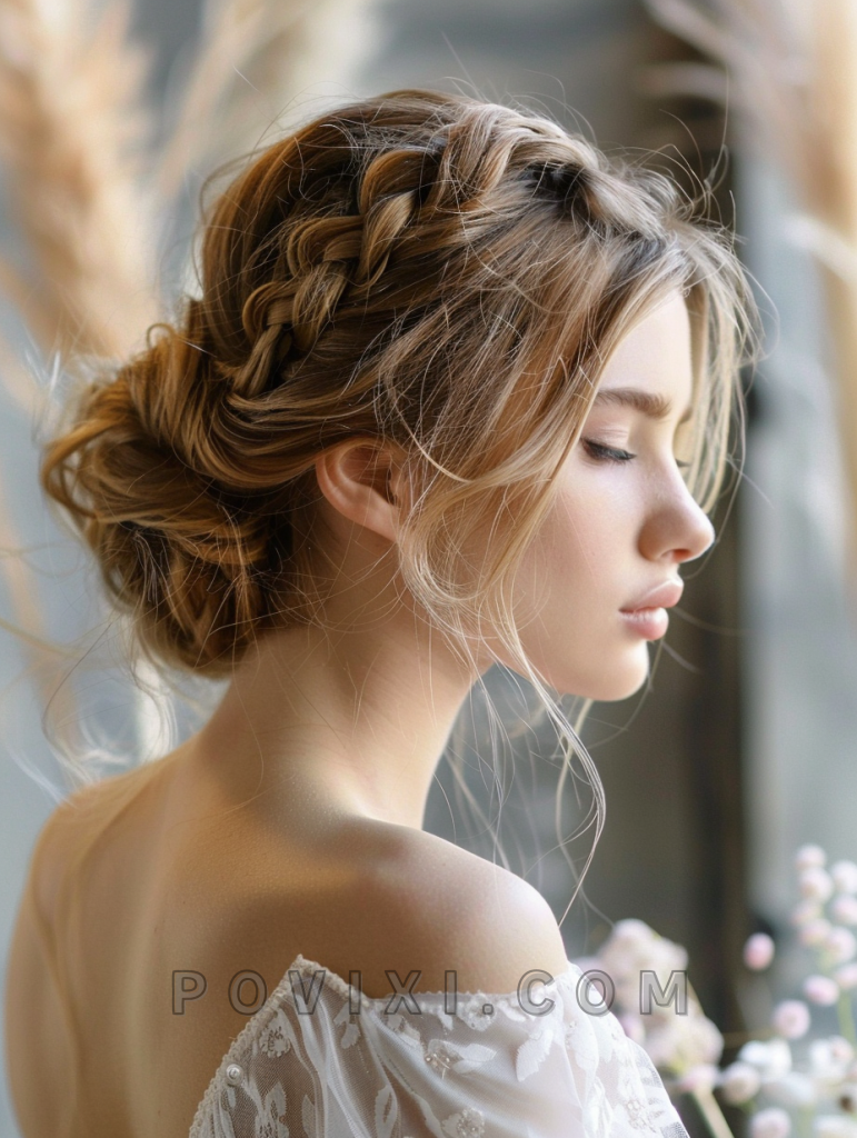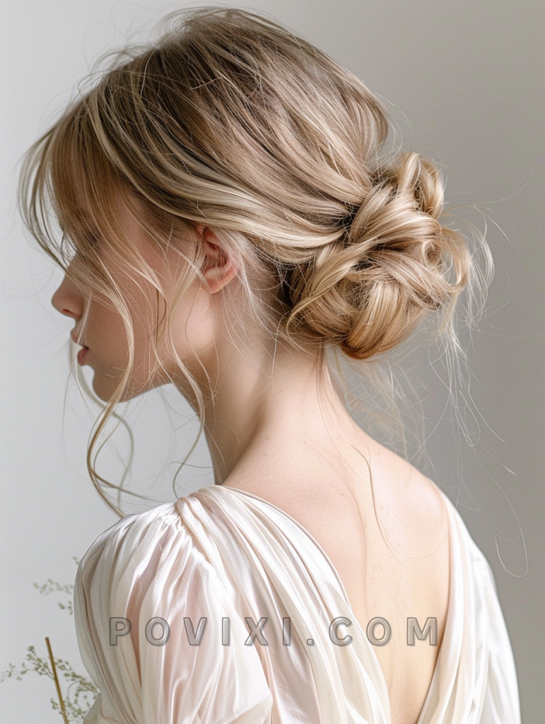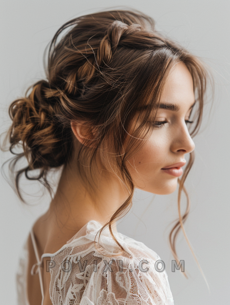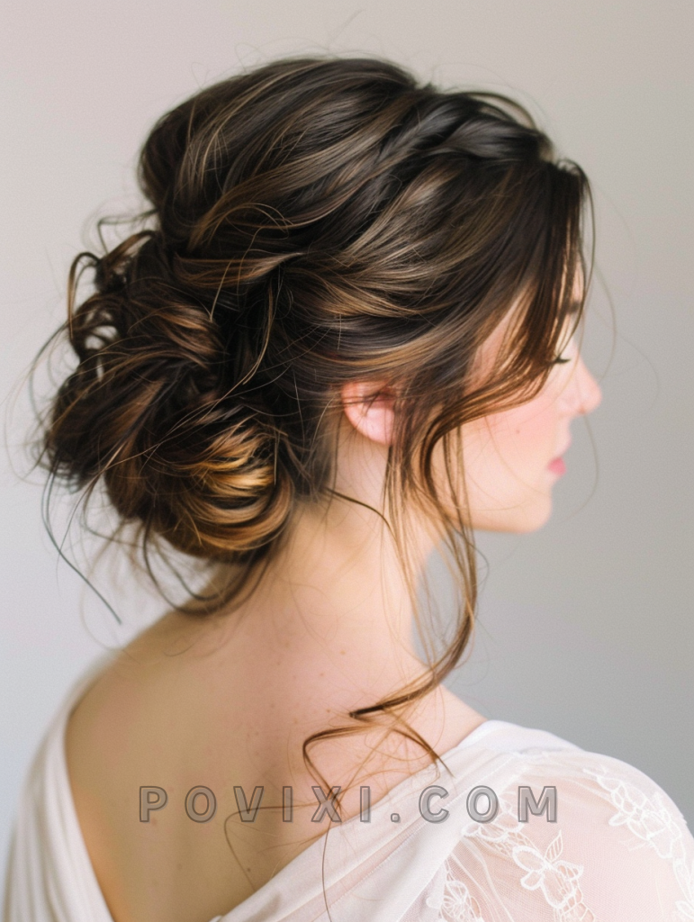 Combining elegance with a touch of bohemian flair, the low bun with side-swept bangs and braided accents is perfect for outdoor weddings or garden parties. This style features a loose bun with intricate braids incorporated into the hairstyle, along with soft side-swept bangs. The braids add an interesting texture and detail, making it suitable for various occasions. This look is particularly flattering for heart and diamond face shapes, as the side-swept bangs help to soften the forehead and emphasize the cheekbones.