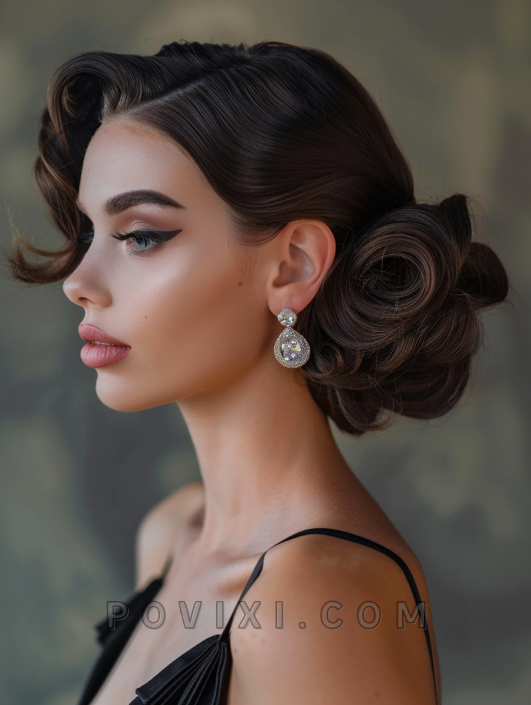 The low bun with bangs and vintage waves is a glamorous and timeless hairstyle inspired by the classic looks of the past. This style features a low bun with vintage-style waves in the bangs, creating a sophisticated and elegant appearance. The waves add a retro charm, making this hairstyle perfect for vintage-themed events, formal occasions, or weddings. It suits all face shapes, especially round and oval faces, enhancing their natural contours.