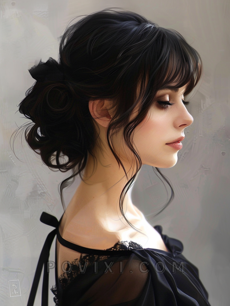 The low bun with bangs and a side twist accent is a chic and versatile hairstyle perfect for both casual and formal occasions. This style features a low bun with a twist detail on one side, adding a subtle yet stylish element to the overall look. The bangs can be styled in various ways, such as straight, side-swept, or softly curled, to suit the occasion and personal preference. This hairstyle suits all face shapes and is particularly flattering for oval and heart-shaped faces.