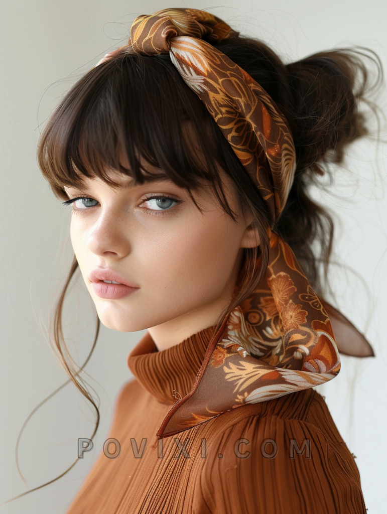 The low bun with bangs and a scarf wrap is a trendy and versatile hairstyle that adds a pop of color and style. This look features a low bun wrapped with a scarf, with bangs styled straight, wavy, or curly. The scarf can be tied in various ways, offering endless styling possibilities. This hairstyle is perfect for casual outings, beach days, or a laid-back brunch with friends. It suits all face shapes and can be customized with different scarf patterns and colors.