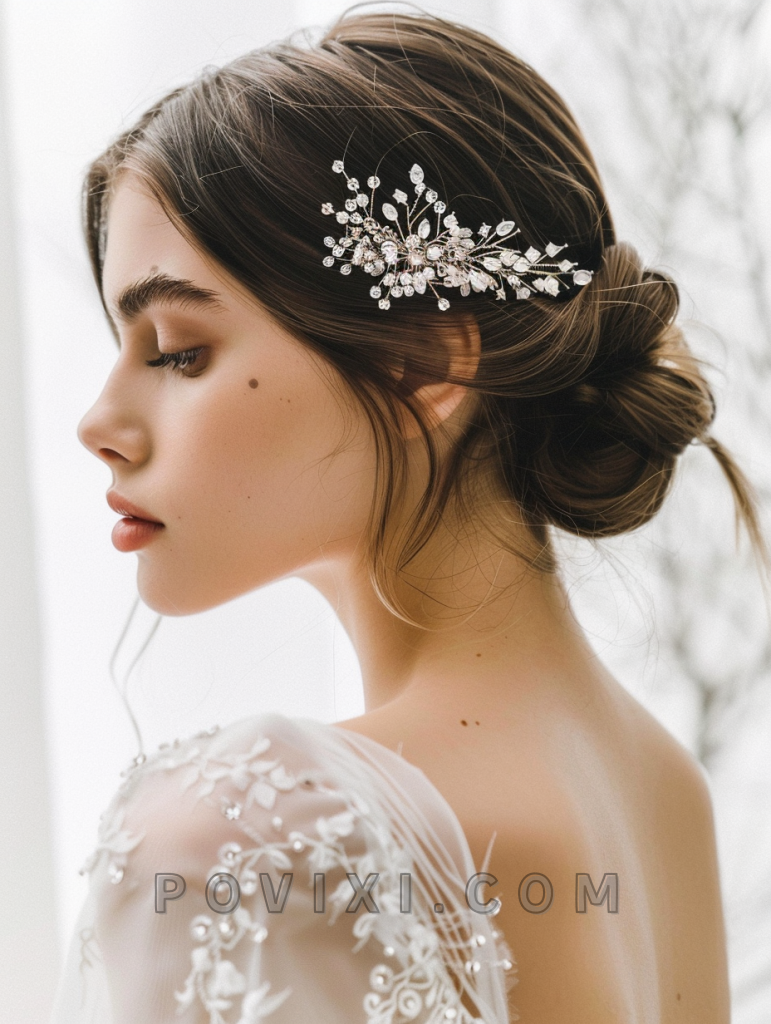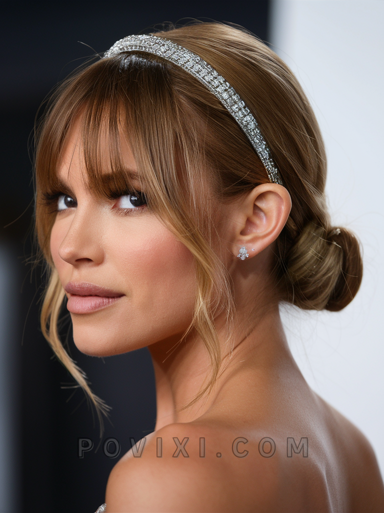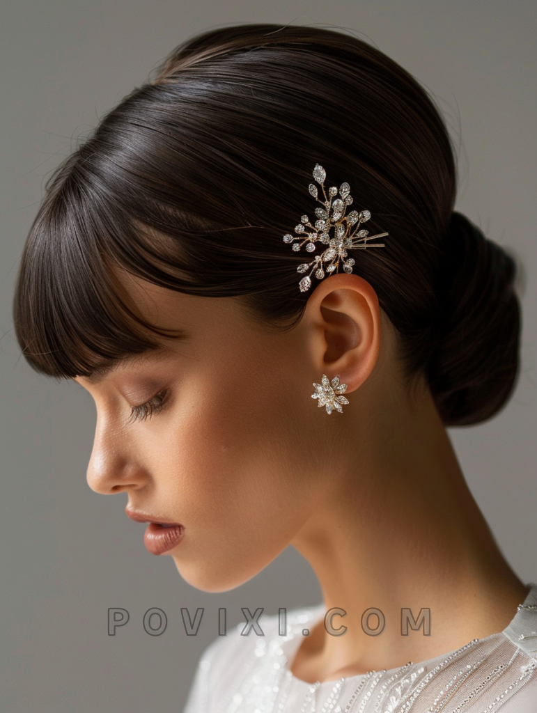For a touch of sparkle, the low bun with bangs and crystal hairpins is a dazzling option. This hairstyle features a sleek low bun adorned with crystal hairpins or clips, paired with straight or side-swept bangs. The crystals add a touch of glamour and shine, making this look perfect for formal events, holiday parties, or weddings. It suits all face shapes and adds a luxurious touch to any outfit.
