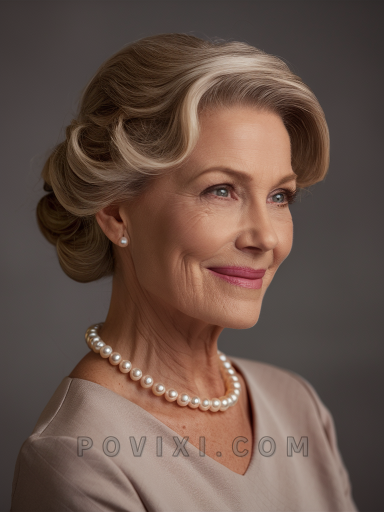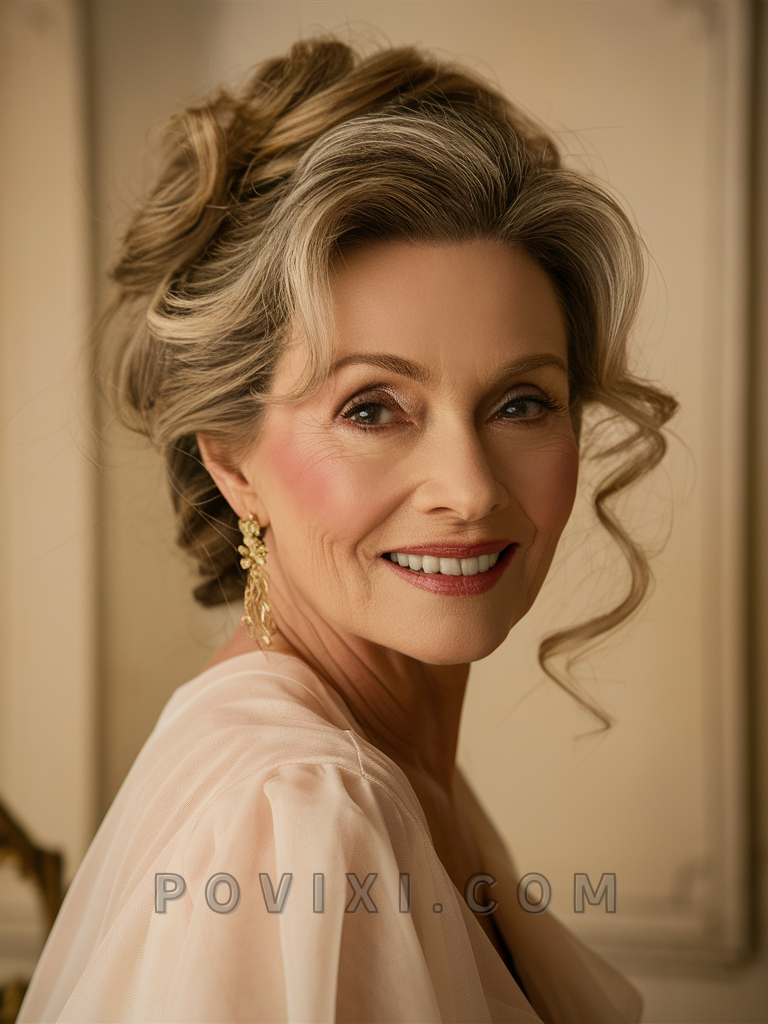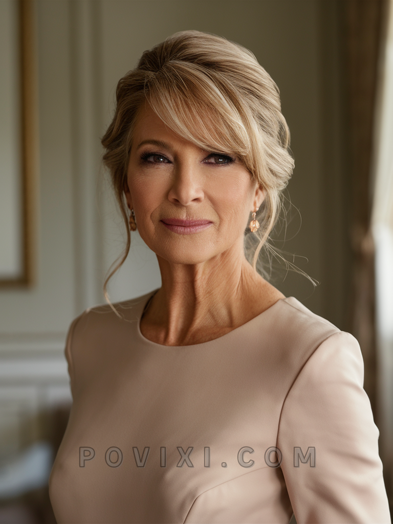 The loose chignon with side bangs is a classic and sophisticated hairstyle that exudes timeless elegance. This updo features a soft, loose bun at the nape of the neck, with side-swept bangs framing the face. It’s an ideal choice for women with an oval face or round face, as the bangs can soften facial features and add a touch of romance. This hairstyle is perfect for formal events, such as weddings, galas, or cocktail parties.