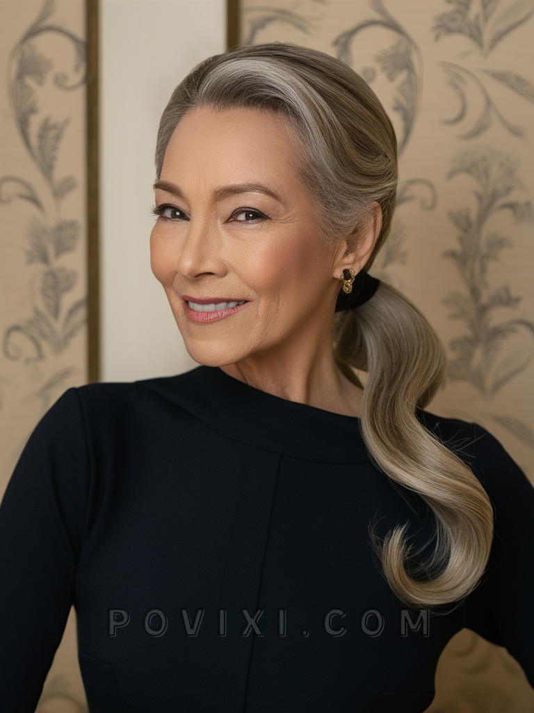 The classic low ponytail with a twist is an elegant and practical hairstyle that never goes out of style. This look is ideal for women with brunette or blonde hair who want a polished yet relaxed appearance. The ponytail is secured at the nape of the neck, with a section of hair wrapped around the base to hide the hair tie. It’s a versatile style suitable for both casual outings and more formal events, making it a go-to choice for many. This hairstyle flatters most face shapes, including oval, round, and heart-shaped faces, and works well with both straight and wavy hair textures.