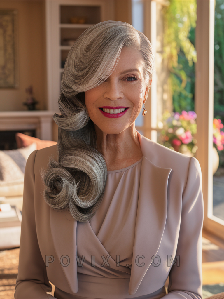 Side-swept curls offer a glamorous and elegant look that is perfect for special occasions. This hairstyle is characterized by voluminous curls swept to one side, creating a sophisticated and feminine appearance. It’s an excellent choice for women with an oval face or round face, as the side sweep adds asymmetry that can balance facial features. Side-swept curls work beautifully for medium to long hair and can be complemented with accessories like a sparkly hair clip or a decorative pin.