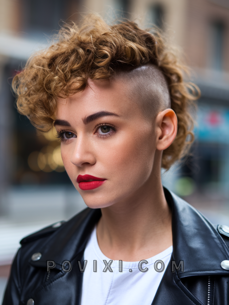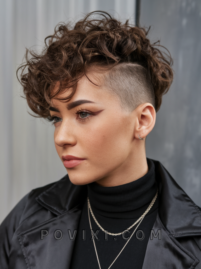 The curly mohawk with undercut is a bold statement hairstyle for those who love experimenting with their look. This edgy cut features voluminous curls on top and a closely shaved undercut, perfect for masc women or anyone looking for a daring style. It works beautifully for formal events when paired with statement accessories or for a casual night out.