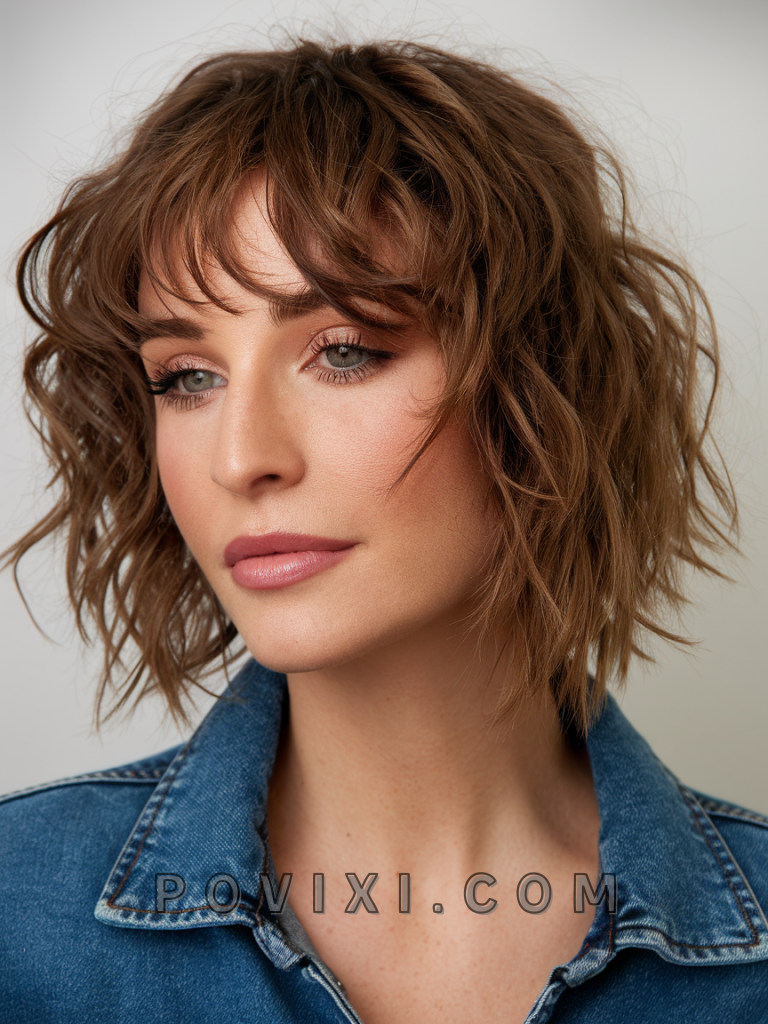 The curly shag with layers is a trendy and carefree style perfect for those who embrace natural texture. Its choppy layers add dimension, making it an excellent choice for women with round faces or those with thick hair. The layered effect frames the face, while the tousled curls give off an effortlessly cool vibe. It’s a fantastic option for casual outings or music festivals.