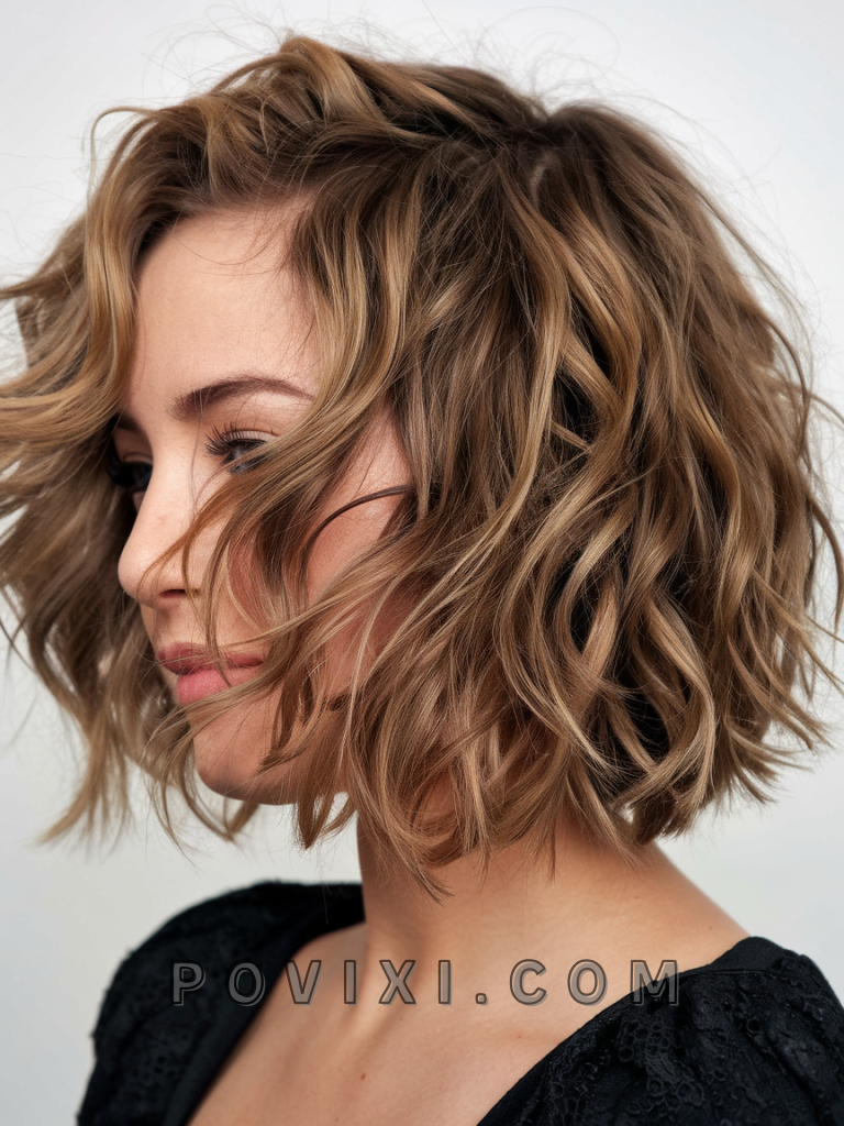 To style, use a volumizing mousse and a round brush to lift the roots while blow-drying. A flat iron can smooth the bangs for a sleek look, while a curl cream defines the bob’s natural texture. Finish with a shine spray for extra polish.