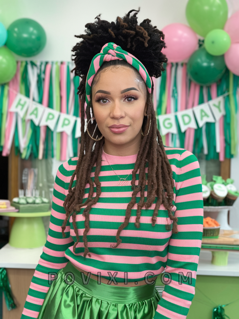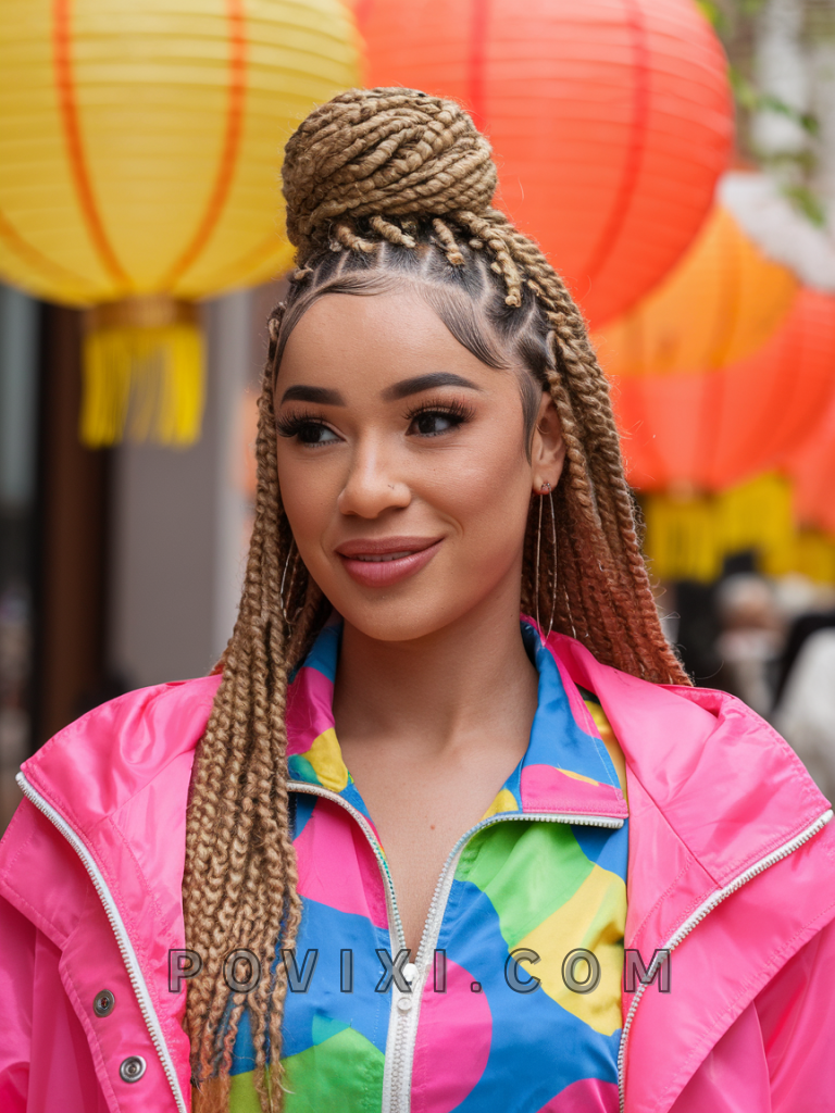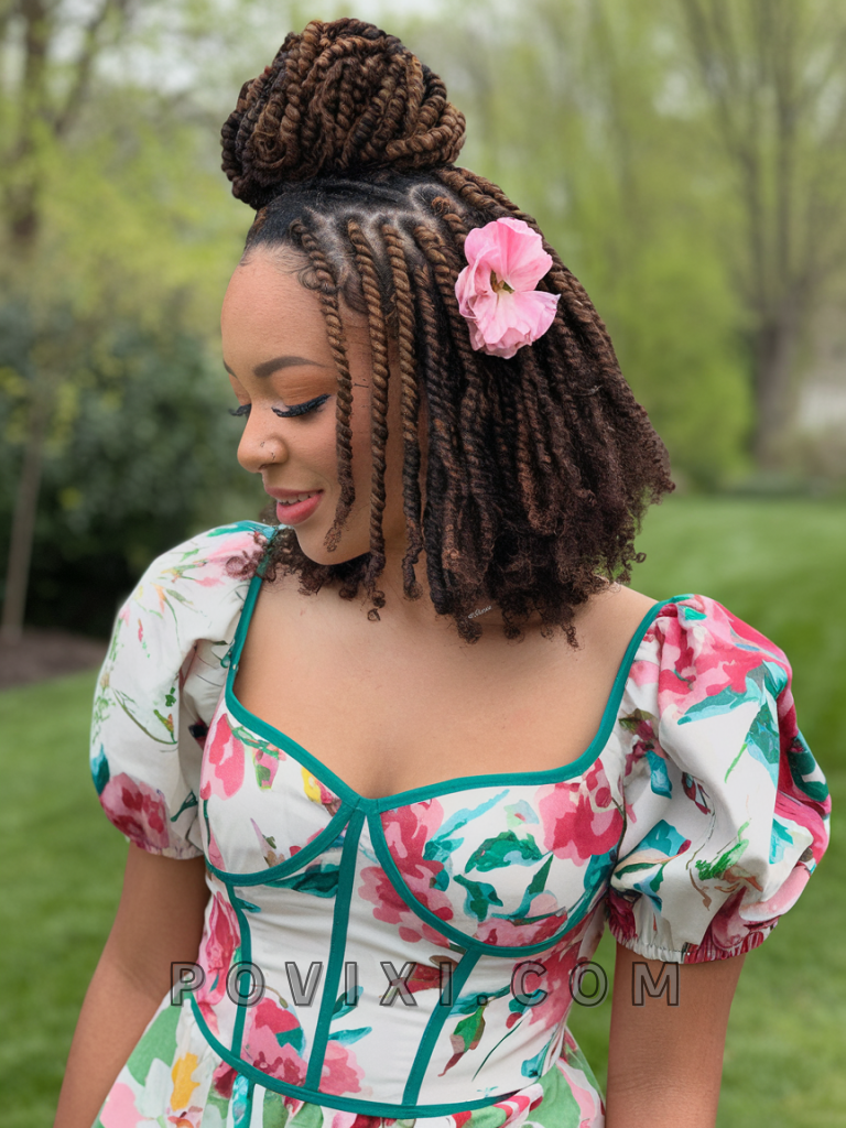 Blend the beauty of locs and afro textures with this chic hybrid style. The combination of spring twists and an afro puff offers volume and drama, perfect for concerts or creative events. It’s especially stunning on heart-shaped faces and darker eye colors.