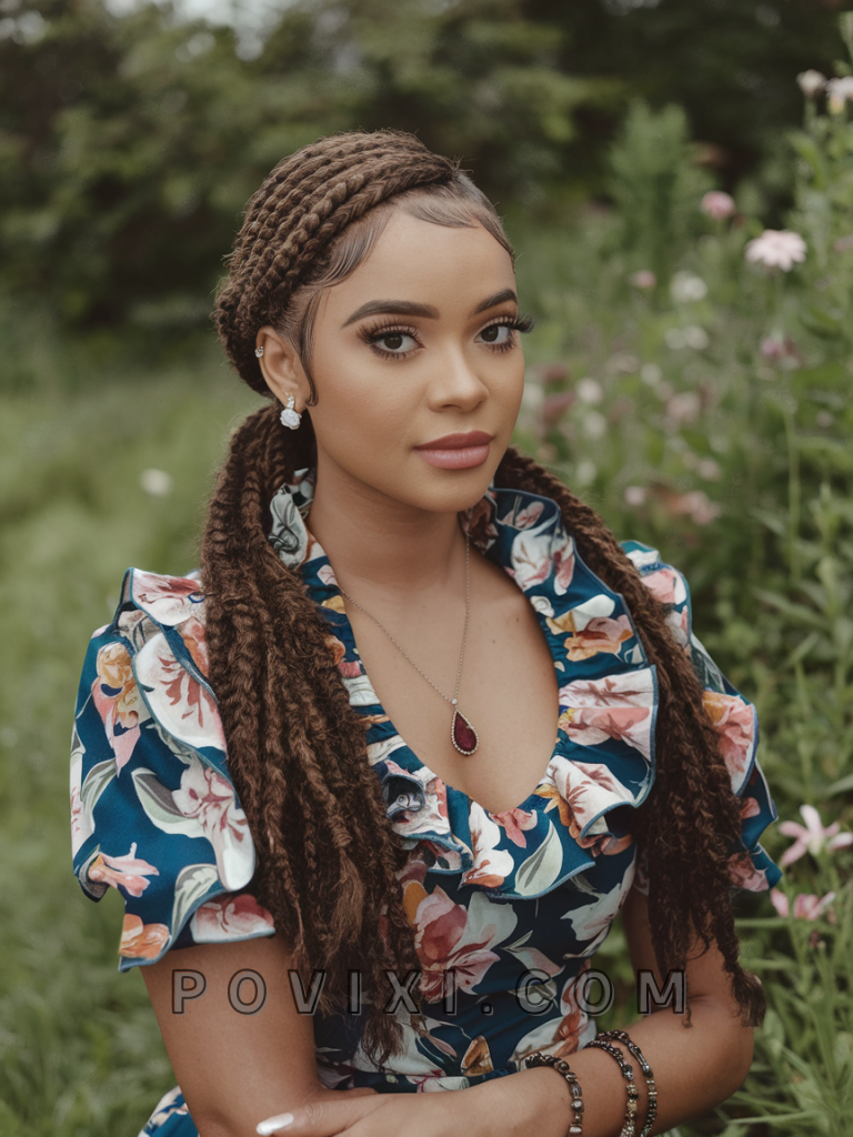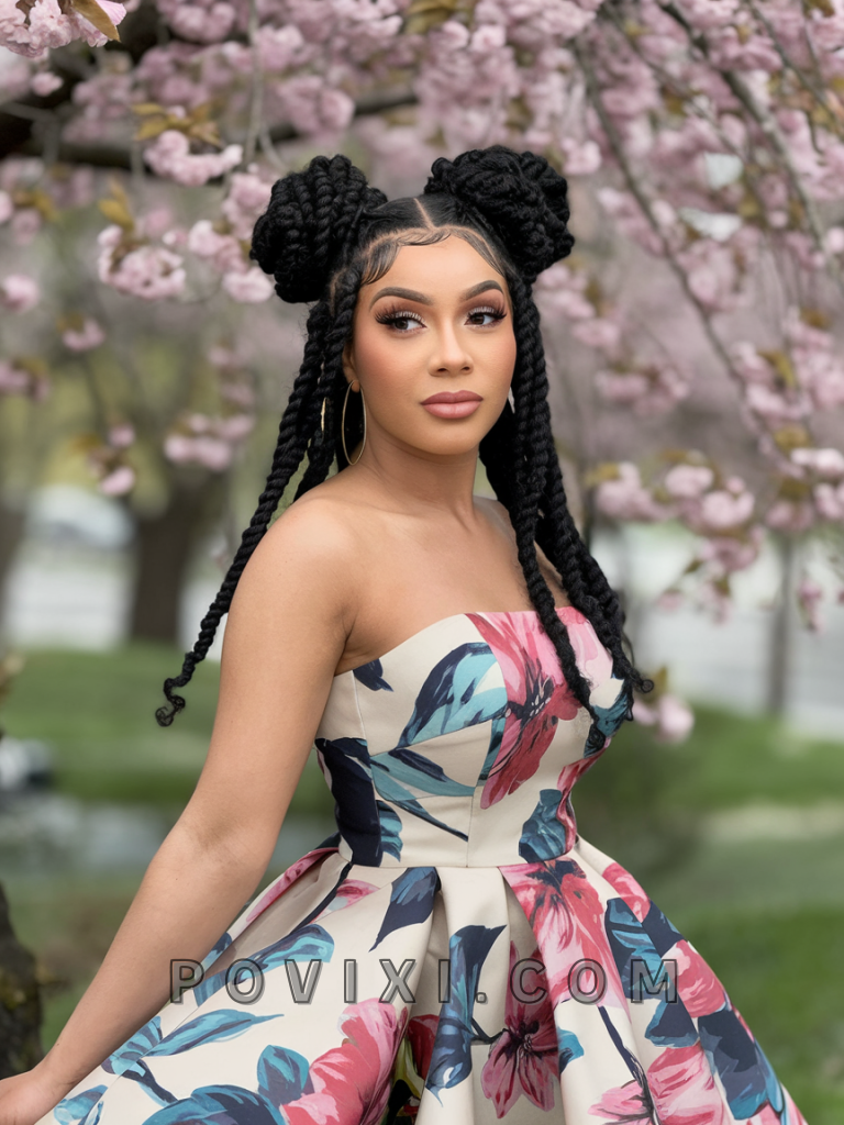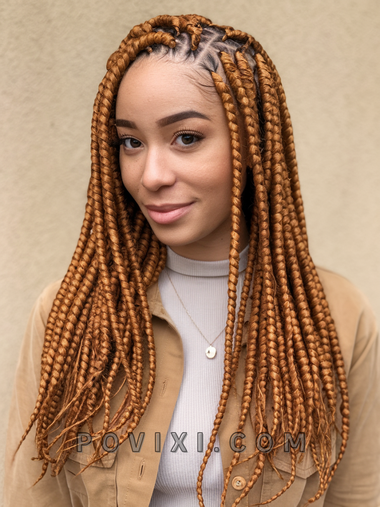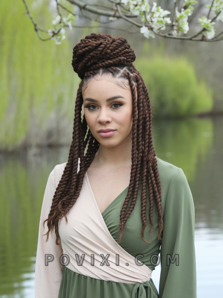 Combine the elegance of long spring twists with the detail of box braids for a dramatic effect. This style works well for vacations, parties, or professional headshots. It suits all face shapes and highlights the natural glow of brown and hazel eyes.