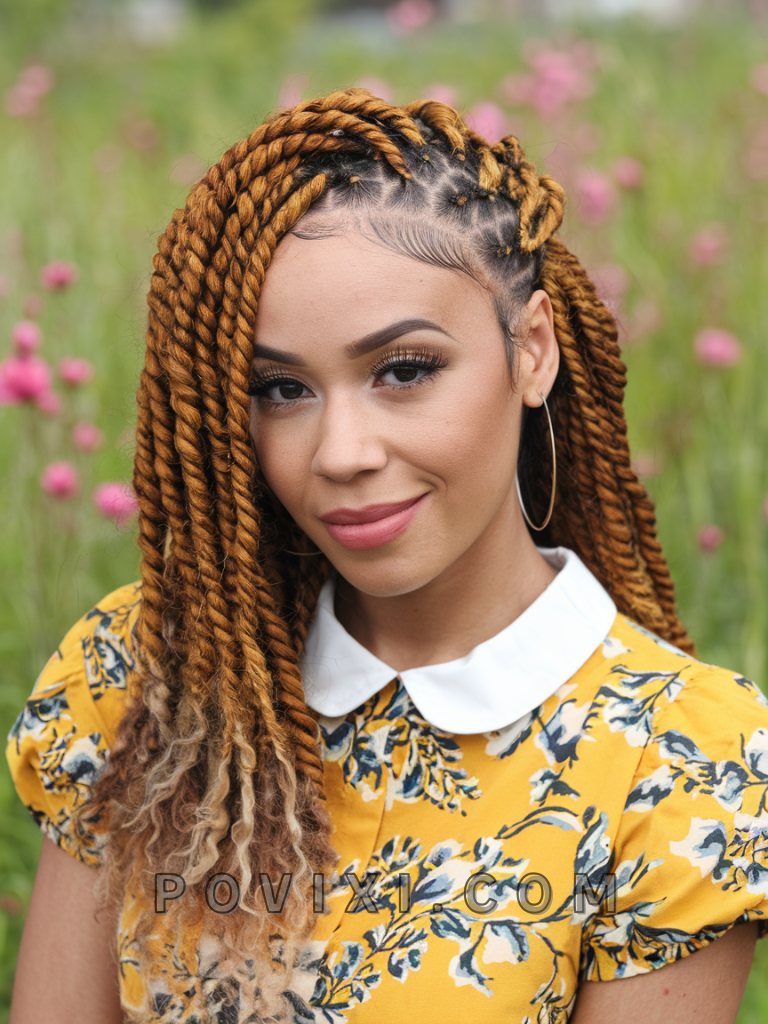 Small spring twists with curls offer a playful and intricate design, perfect for festivals or casual gatherings. This style accentuates the natural bounce of the twists while adding curls for extra volume and texture. It’s particularly flattering for round or square face shapes, and earthy brown or hazel eyes complement it beautifully.