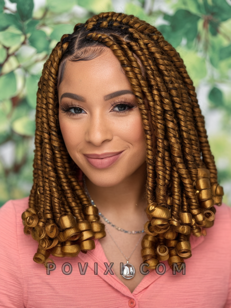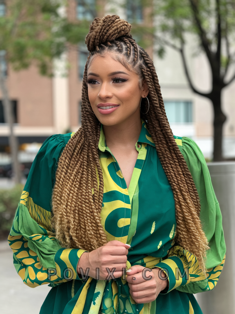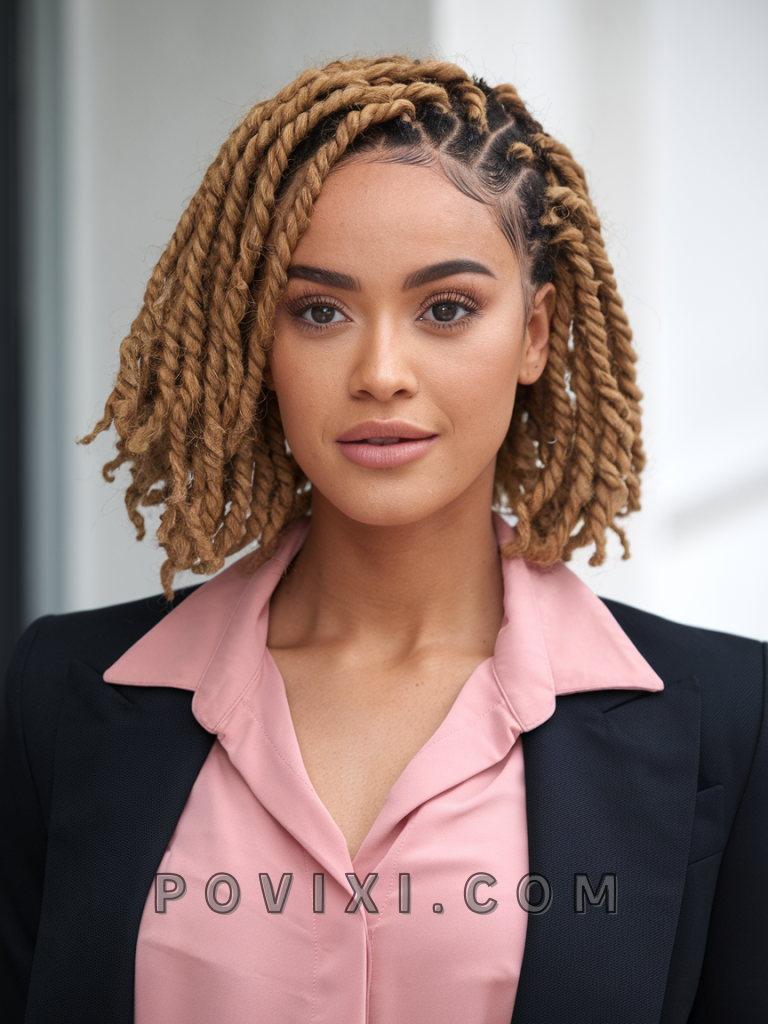 To achieve this look, use pre-colored twist extensions or dye select twists after installation. Ensure the highlights are evenly distributed for a balanced look. Use a color-protecting shampoo to maintain vibrancy and keep the twists moisturized with a light oil spray.