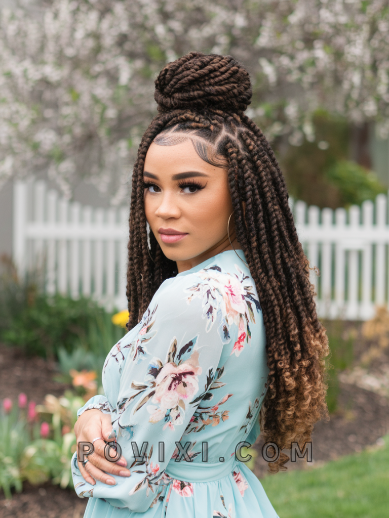 The top knot combined with loose curls is a chic and functional hairstyle, perfect for busy days or casual outings. This look keeps the hair out of the face while showcasing the natural bounce of the twists. It’s flattering for heart and square face shapes, emphasizing cheekbones and jawlines.