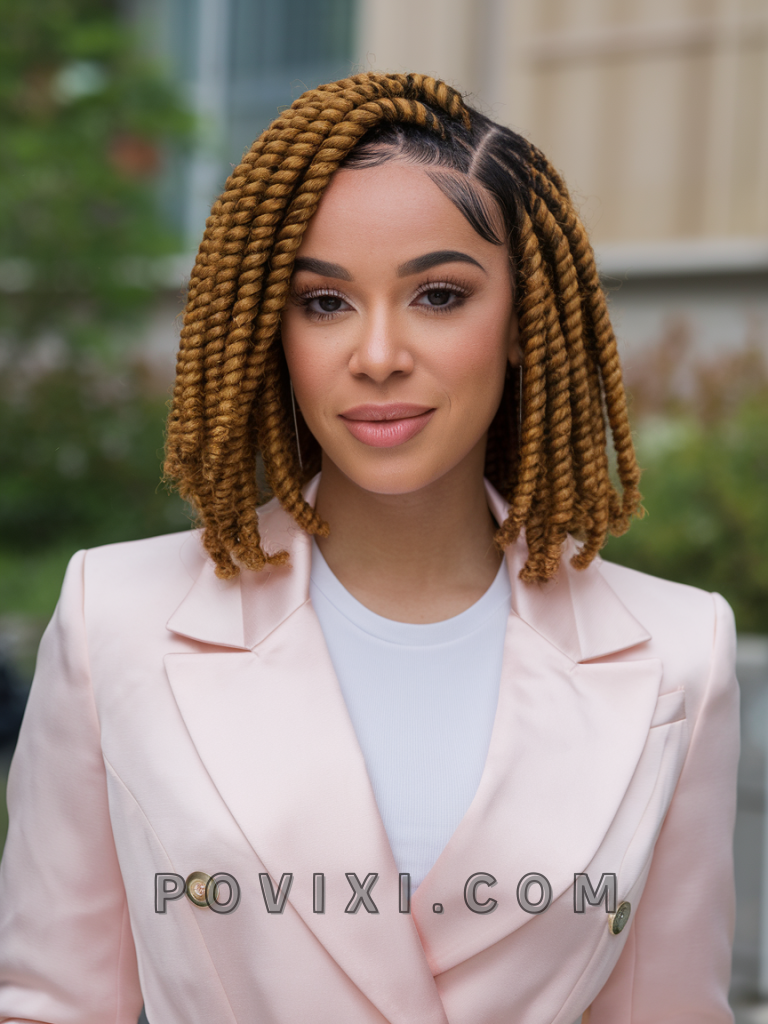 Add flair to the classic short spring twist bob by incorporating bangs. This playful style is ideal for creative workspaces or date nights, complementing oval and square face shapes. The bangs soften the overall look, making it perfect for bold lipstick shades.