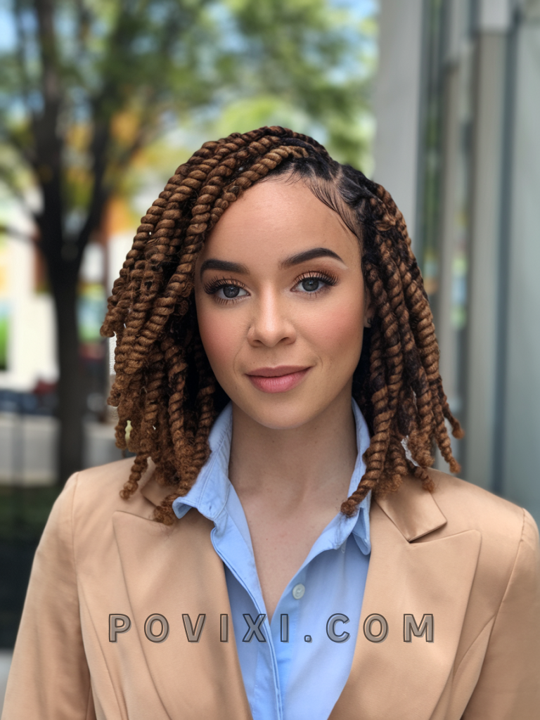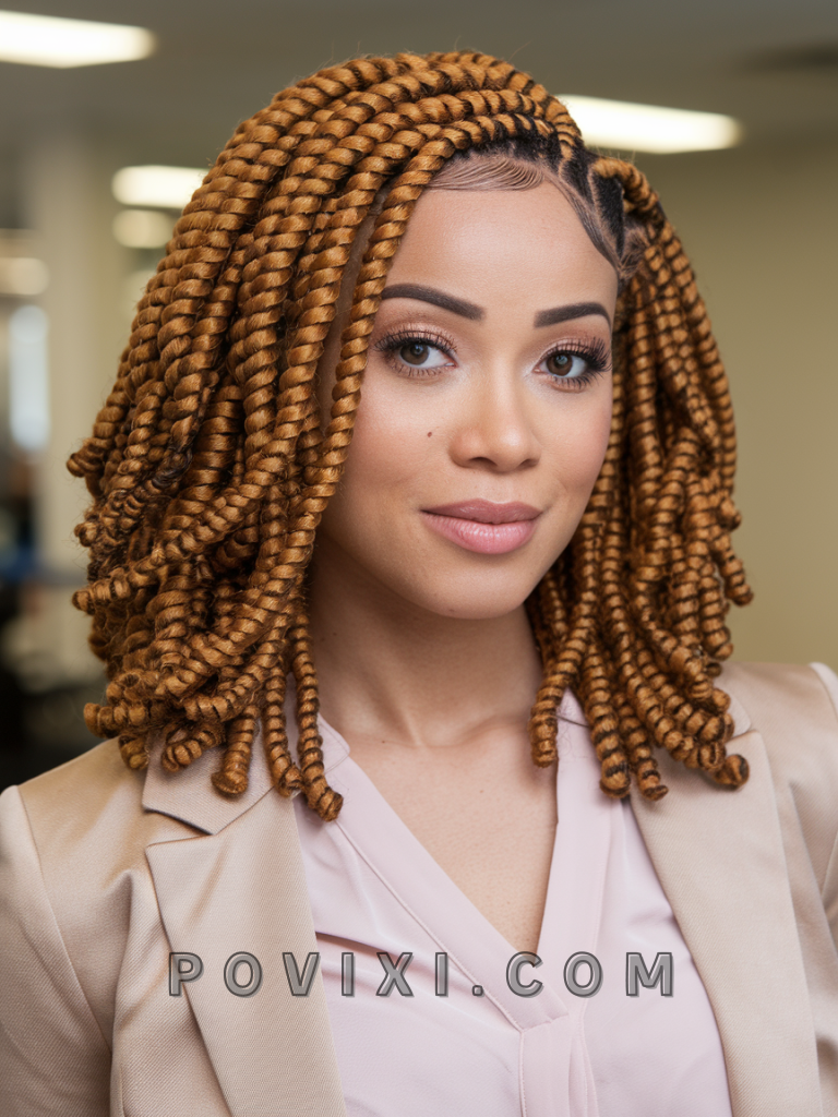 Shoulder-length layered spring twists are perfect for a natural yet polished look. This style suits everyday settings, casual work environments, or coffee dates with friends. The layers add dimension and movement, making it ideal for oval and round face shapes. It pairs beautifully with soft, natural makeup or minimal accessories.