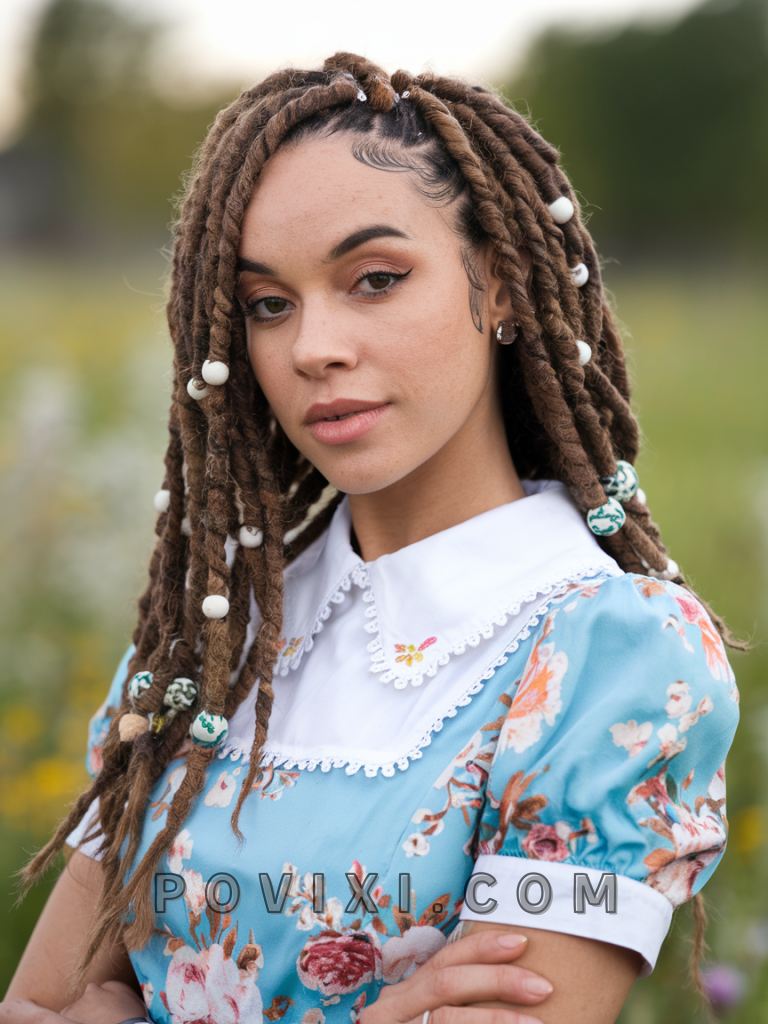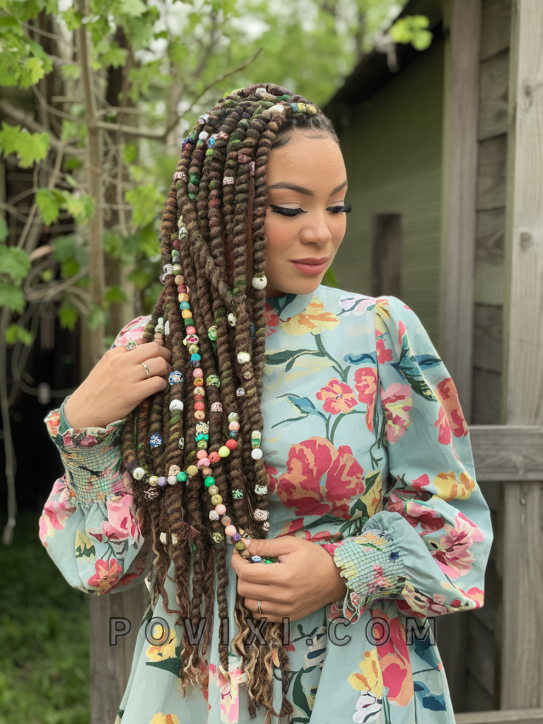Blend the versatility of spring twists with the rugged charm of dreads adorned with beads. This style is ideal for artistic events or cultural celebrations. It complements angular face shapes and accentuates bold makeup looks.