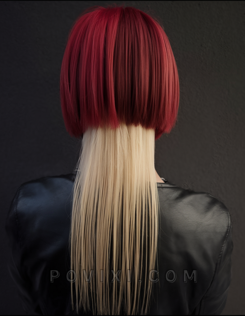 This vibrant take on the jellyfish haircut combines rich, deep red layers with sleek platinum-blonde strands cascading beneath, creating a stark and striking contrast. The top section is bluntly cut around the head, adding a sense of structure, while the platinum layers flow freely, emphasizing the multi-dimensional aspect of the cut. This style is ideal for those wanting a high-impact look that blends short structured layers with the drama of long, straight hair.