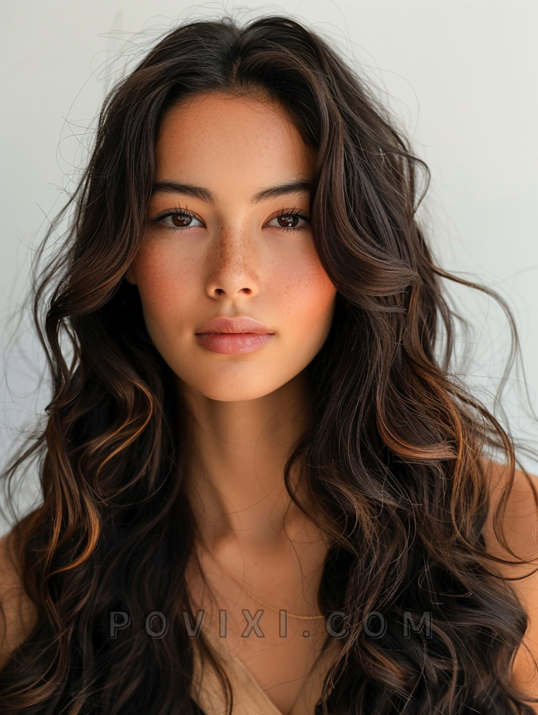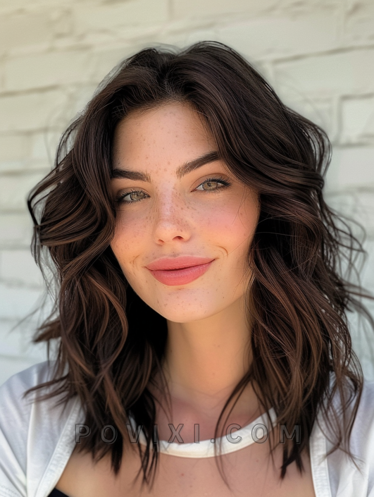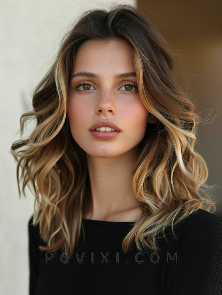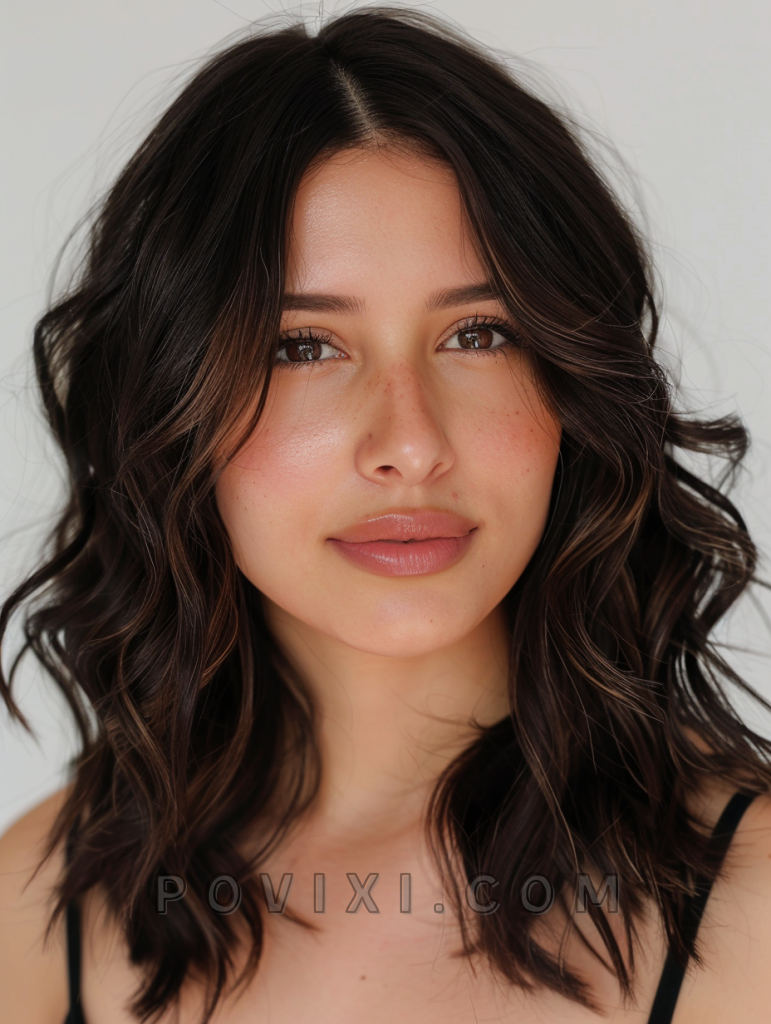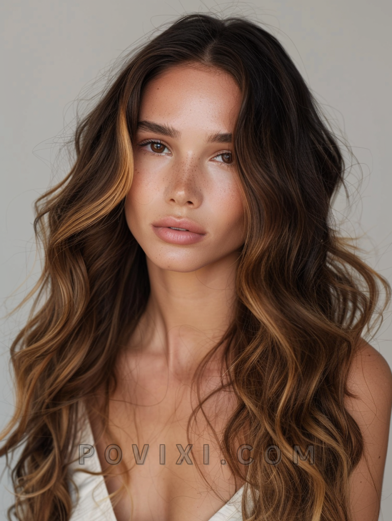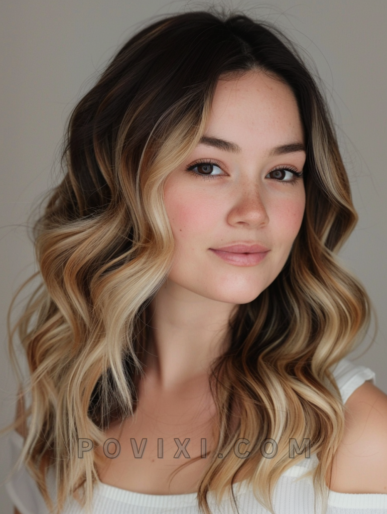 Infuse your dark brown locks with golden highlights that mimic the sun’s natural lightening effects. Ideal for a summer vibe, this style adds a playful touch to wavy hair. It’s perfect for vacations or casual beach days, and suits those with round or oval face shapes and any eye color.