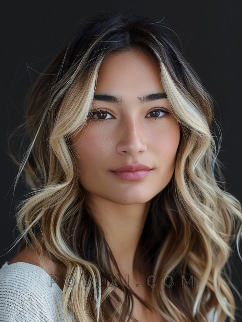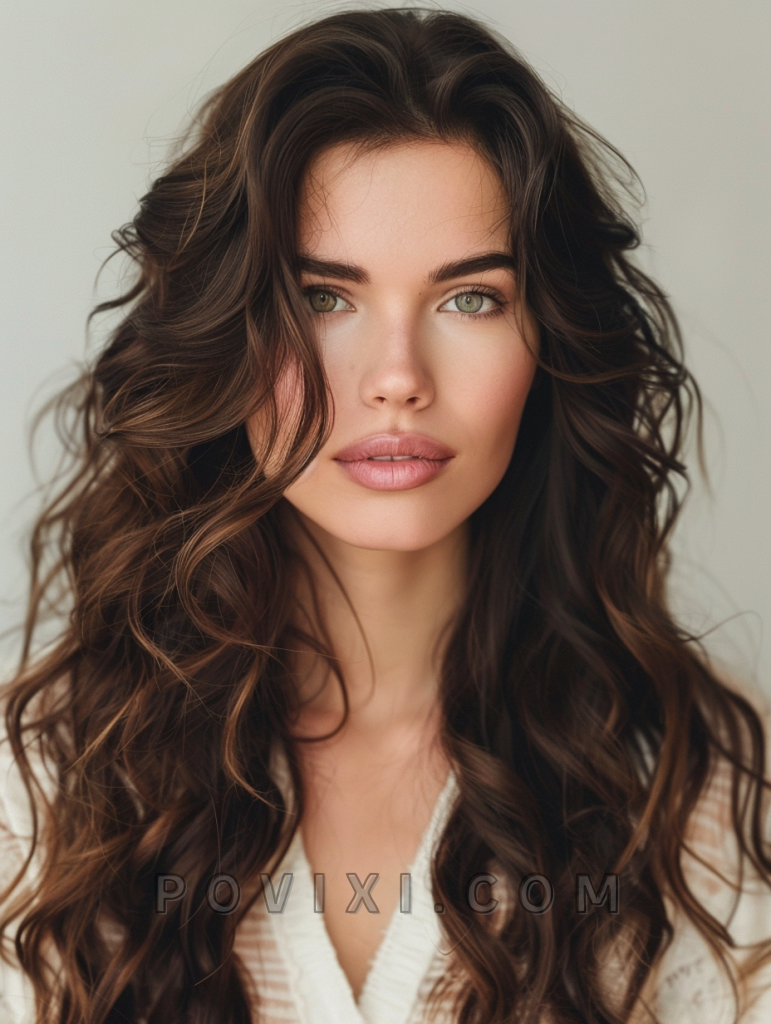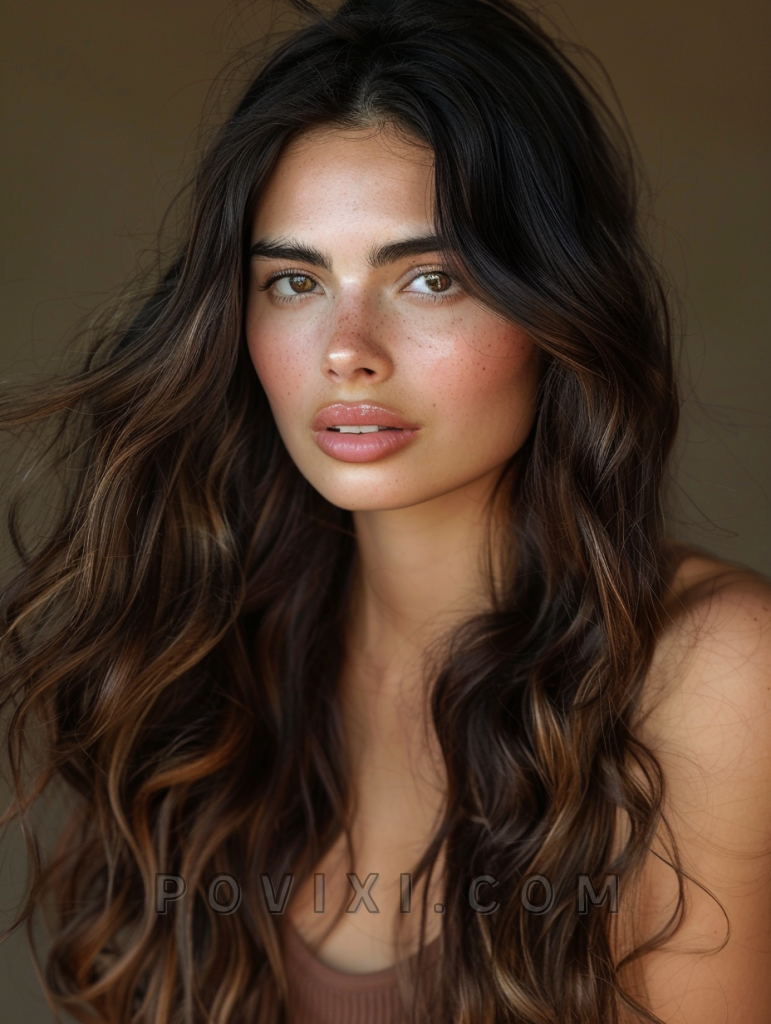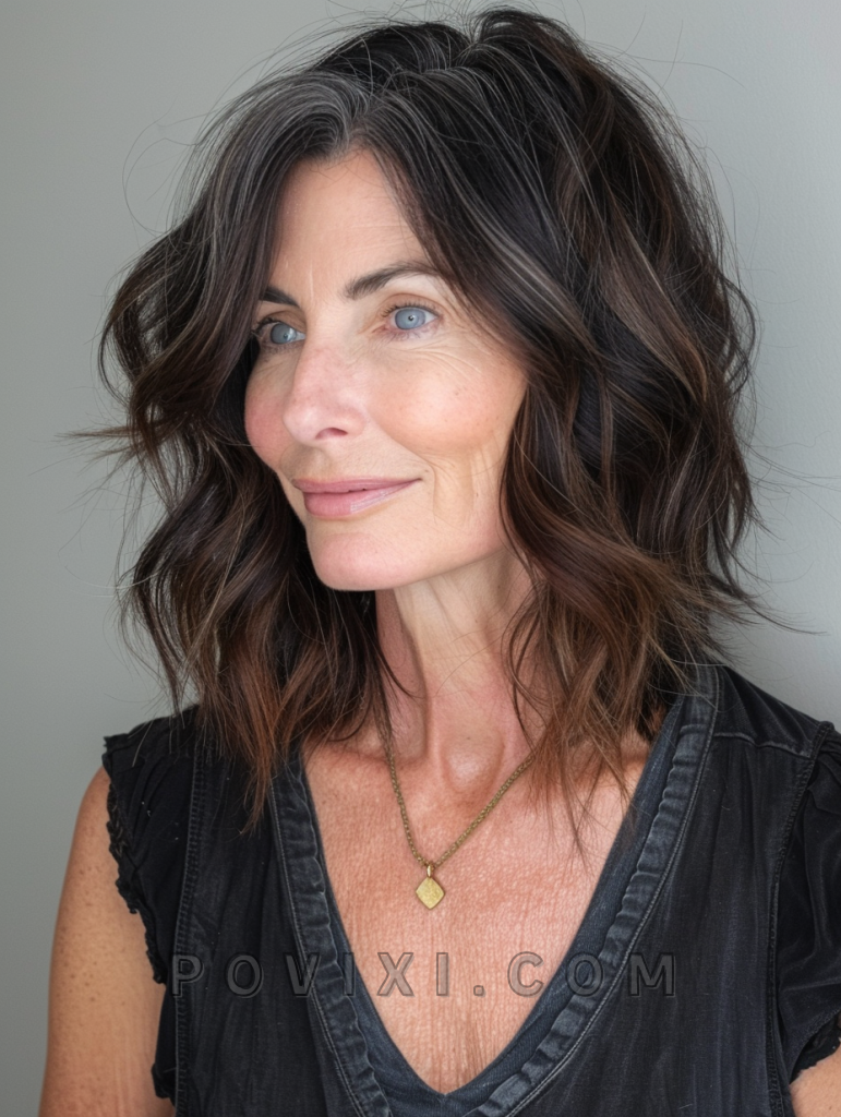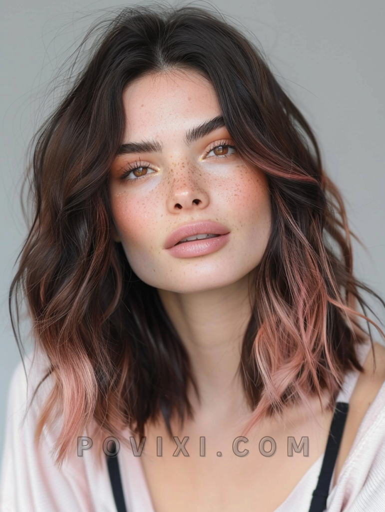 Infuse your dark brown locks with golden highlights that mimic the sun’s natural lightening effects. Ideal for a summer vibe, this style adds a playful touch to wavy hair. It’s perfect for vacations or casual beach days, and suits those with round or oval face shapes and any eye color.