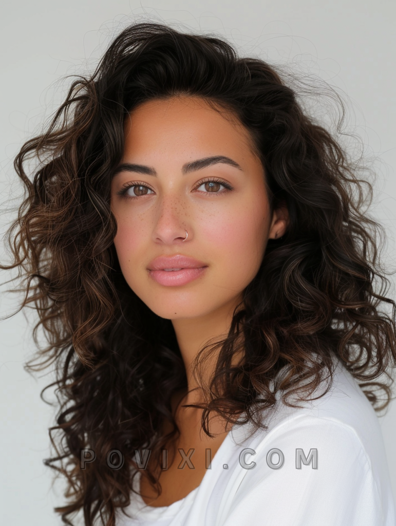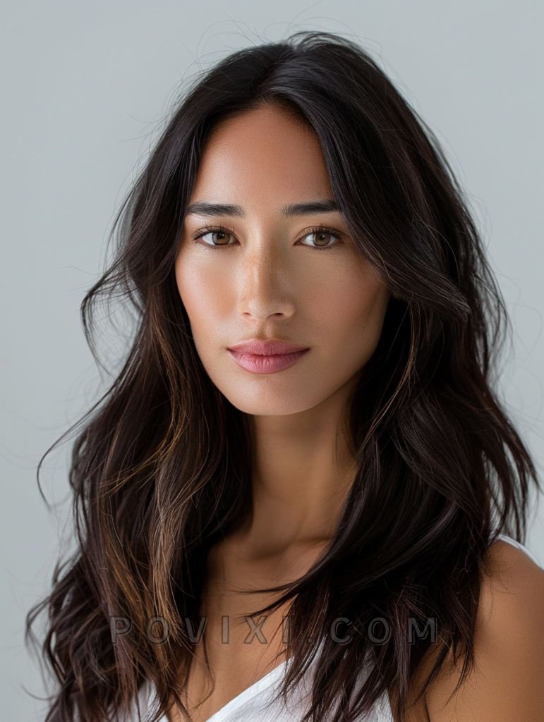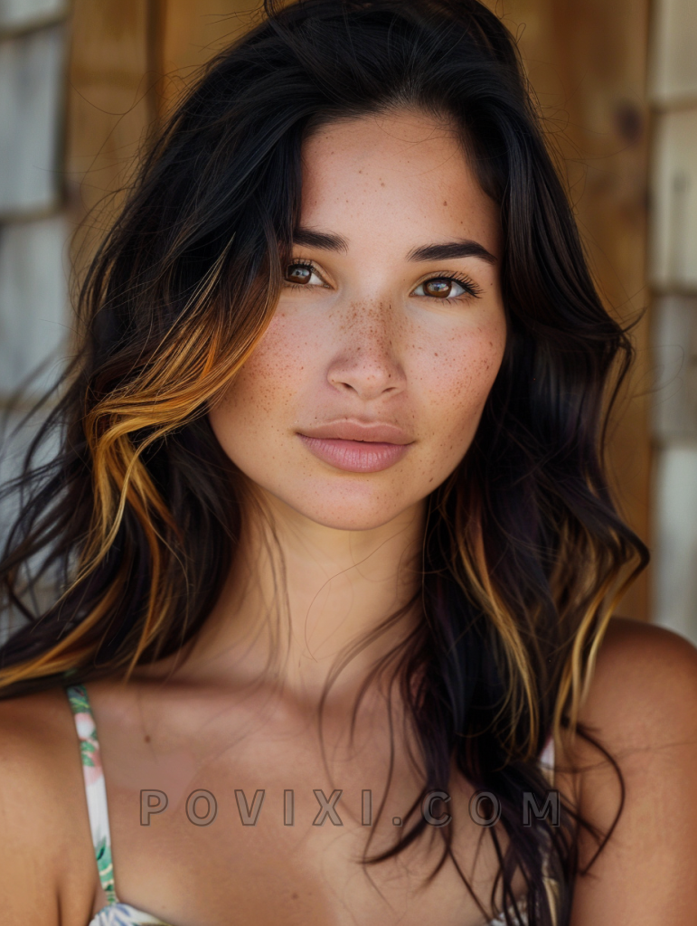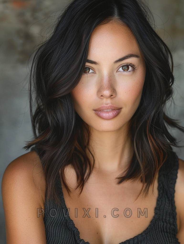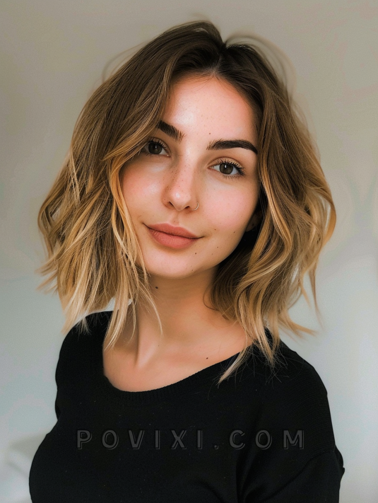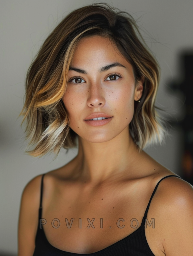 Infuse your dark brown locks with golden highlights that mimic the sun’s natural lightening effects. Ideal for a summer vibe, this style adds a playful touch to wavy hair. It’s perfect for vacations or casual beach days, and suits those with round or oval face shapes and any eye color.