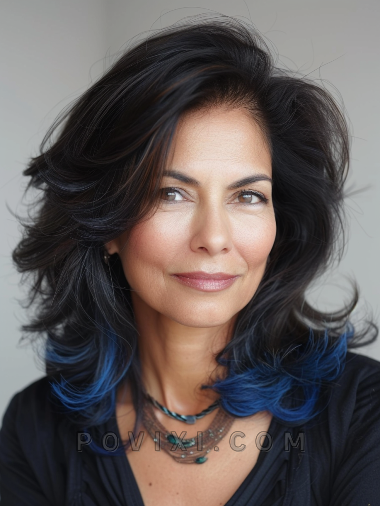 Introduce a hint of mystery with midnight blue highlights, a less traditional but striking choice. This suits older women who want to add an element of intrigue to their hairstyle without overwhelming their features. It’s a great look for evening events.