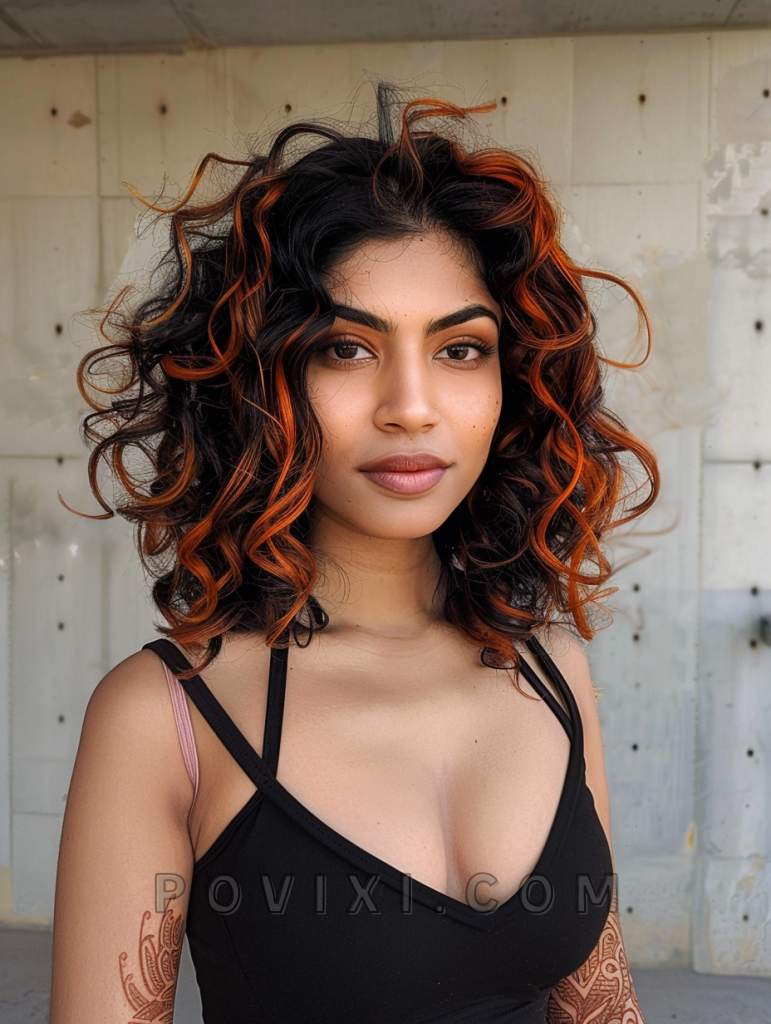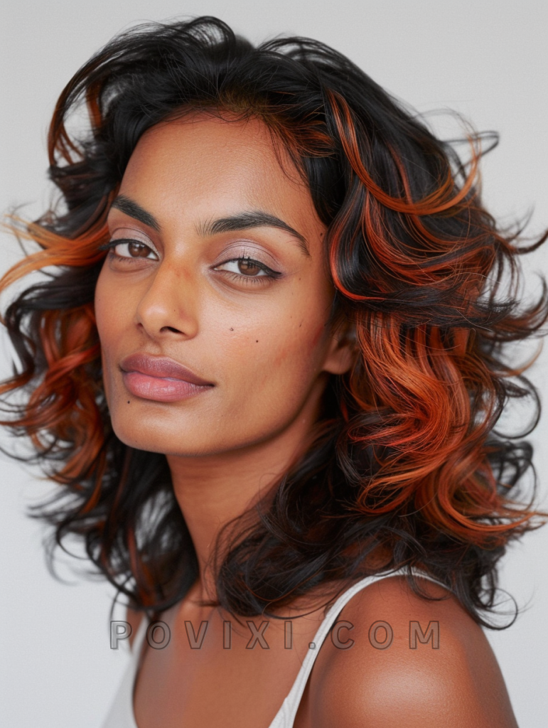 Inject some warmth into your hairstyle with fiery copper streaks. This option is excellent for adding dimension and a fiery personality to wavy or curly hair, suitable for all skin tones but particularly striking on those with Indian skin.