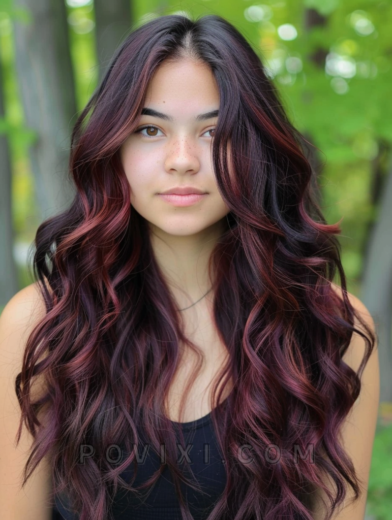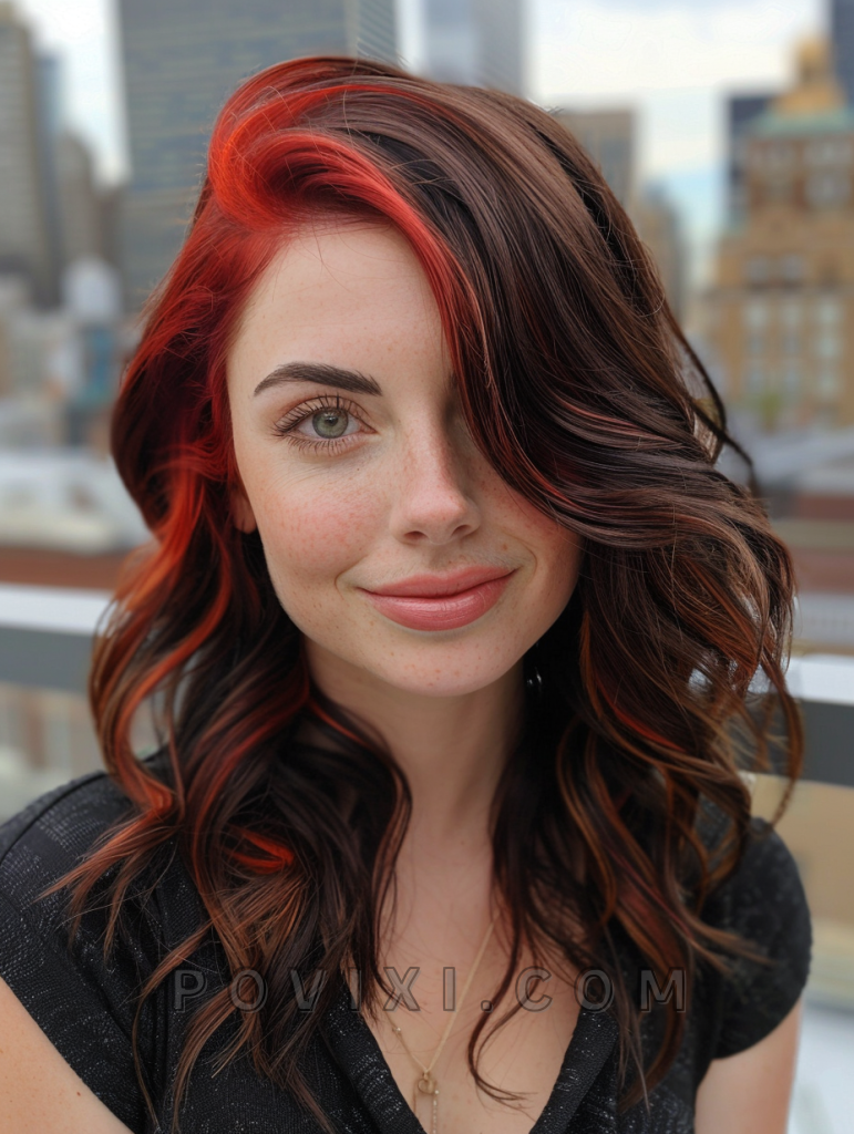 Add a bold splash of color with vibrant red highlights. This choice can transform your dark brown hair into a dynamic and fiery display, suitable for those who want to stand out. The red highlights are particularly effective in curly or wavy hair, where they can enhance the hair’s natural textures and movements.