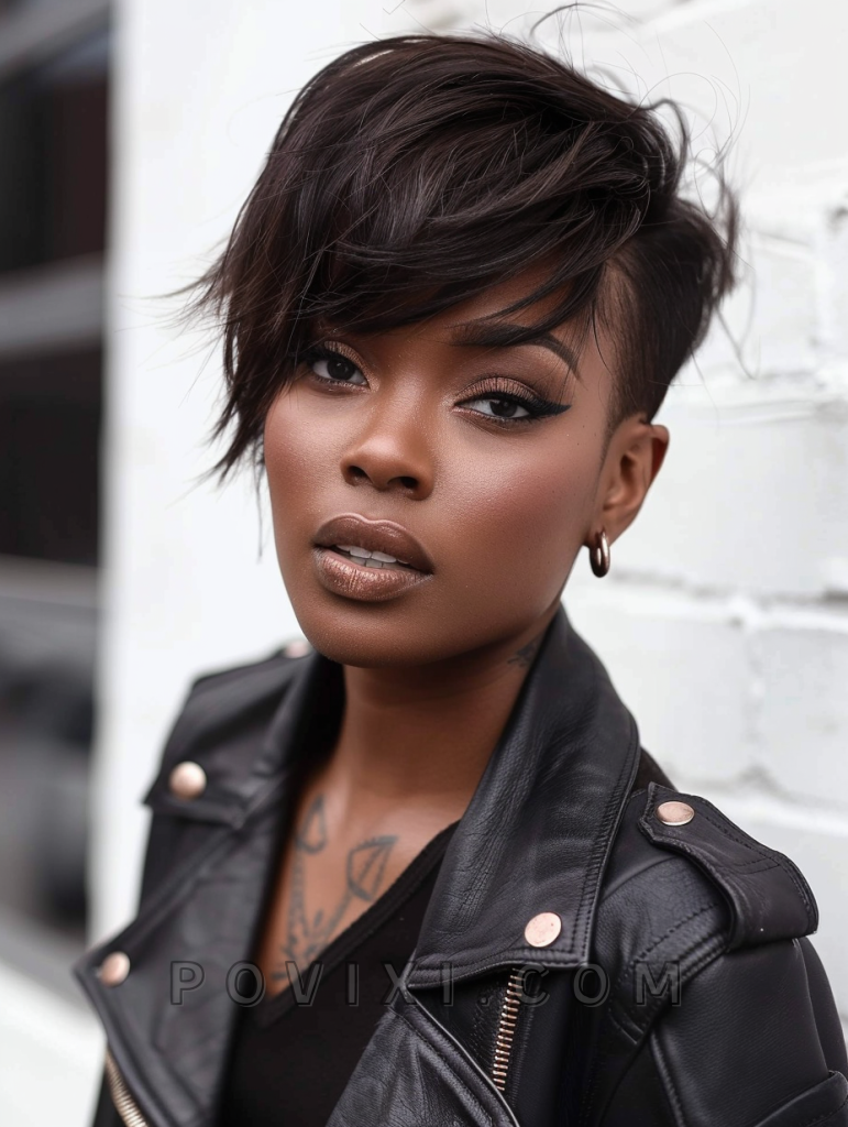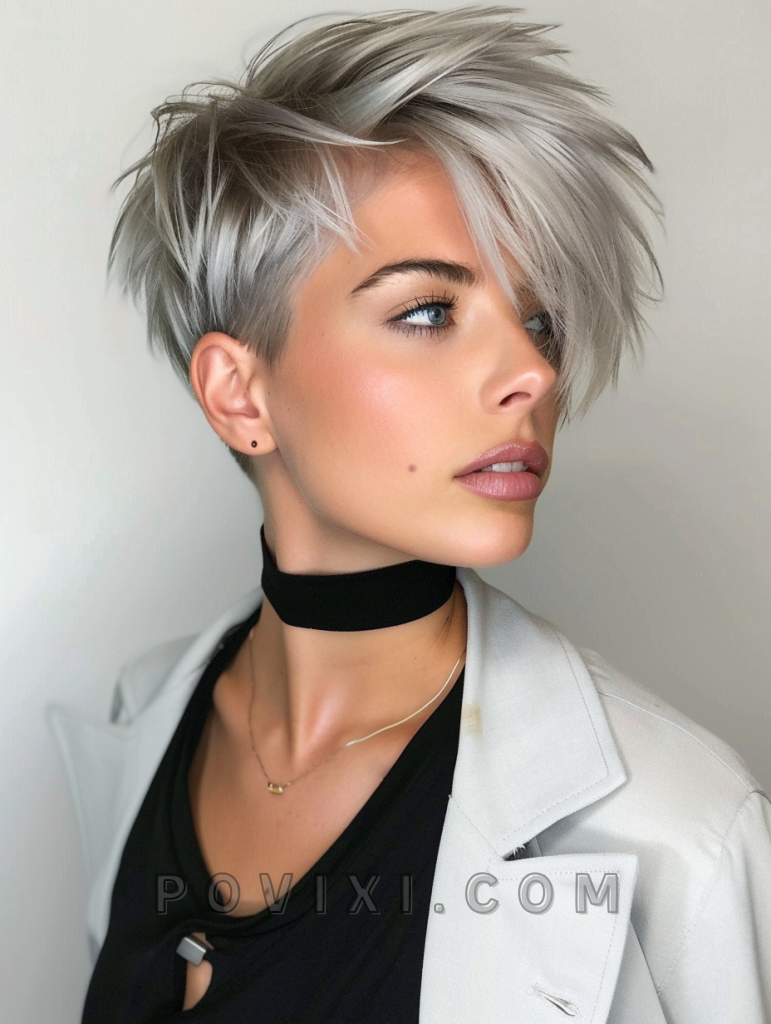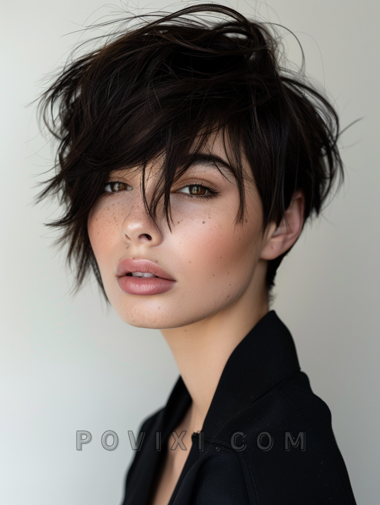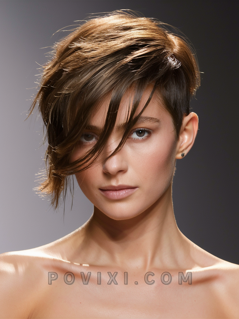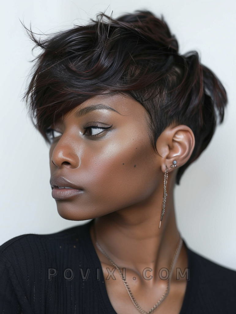 The sleek asymmetrical pixie with side-swept bangs is a polished and sophisticated option. This cut features a smooth finish with bangs that sweep elegantly to one side, creating a sleek and refined look. It’s ideal for round faces and oval faces, adding a touch of elegance and definition.