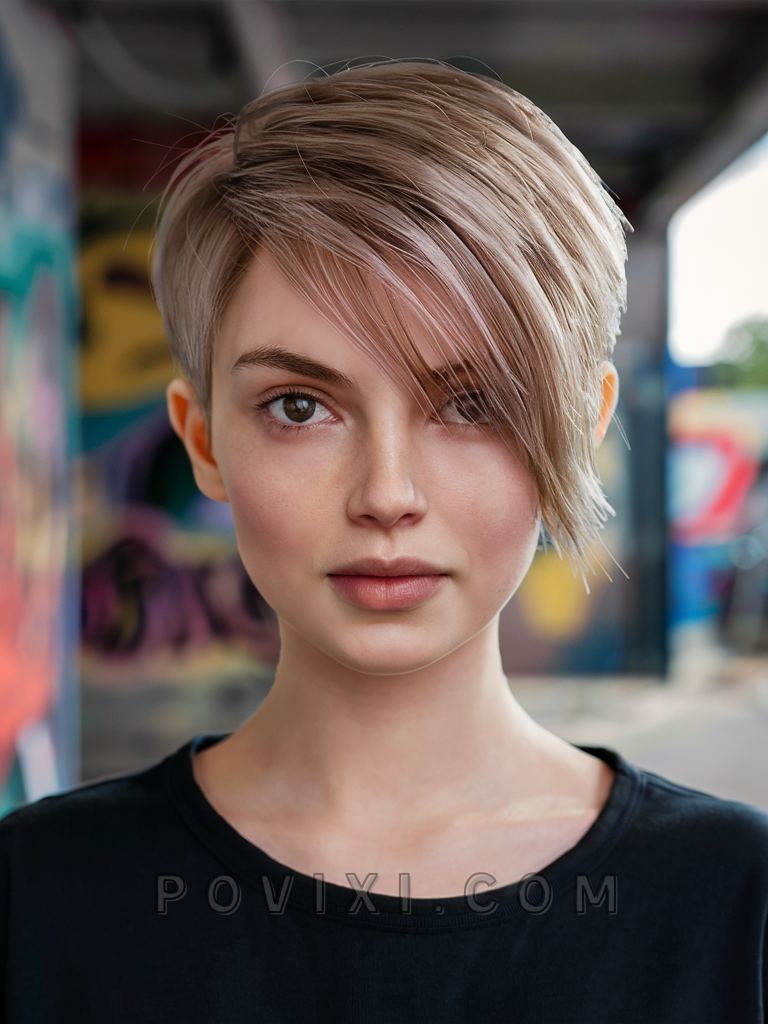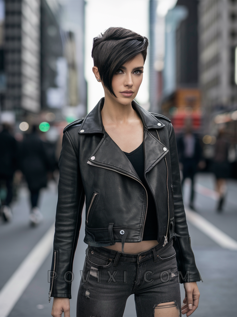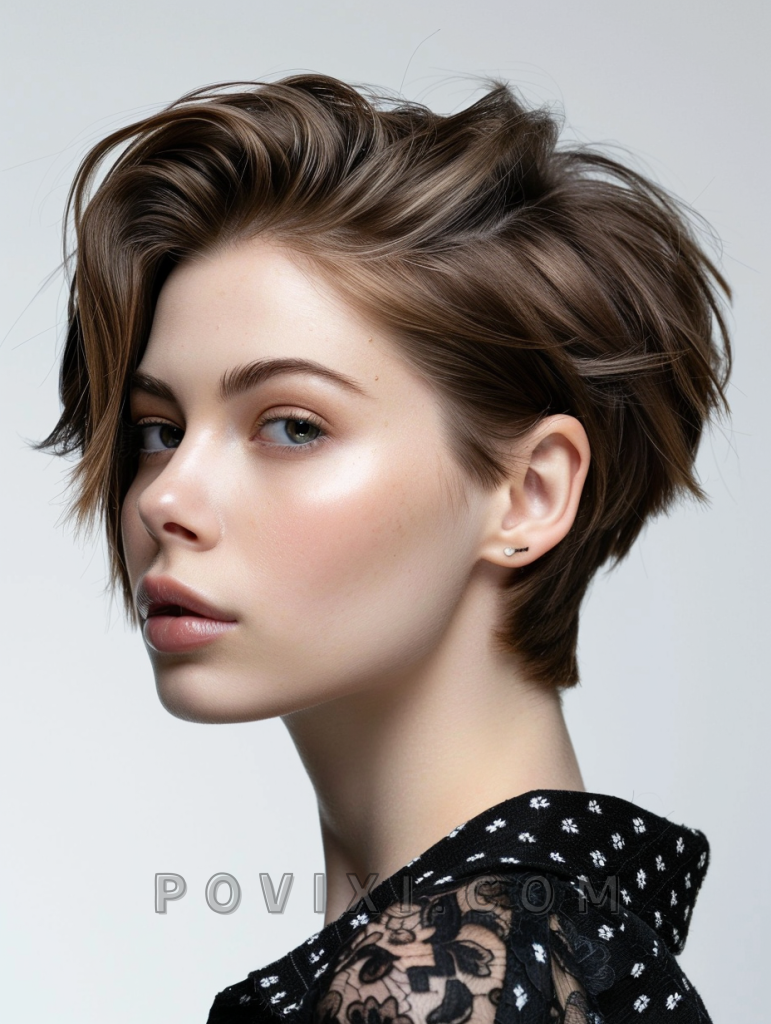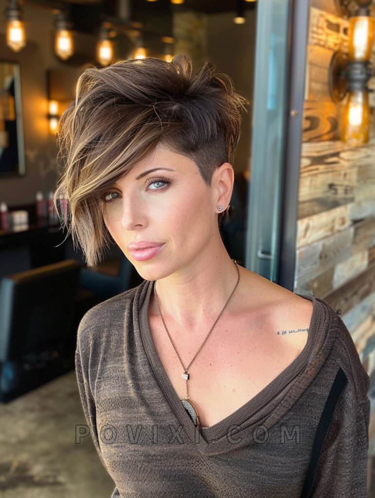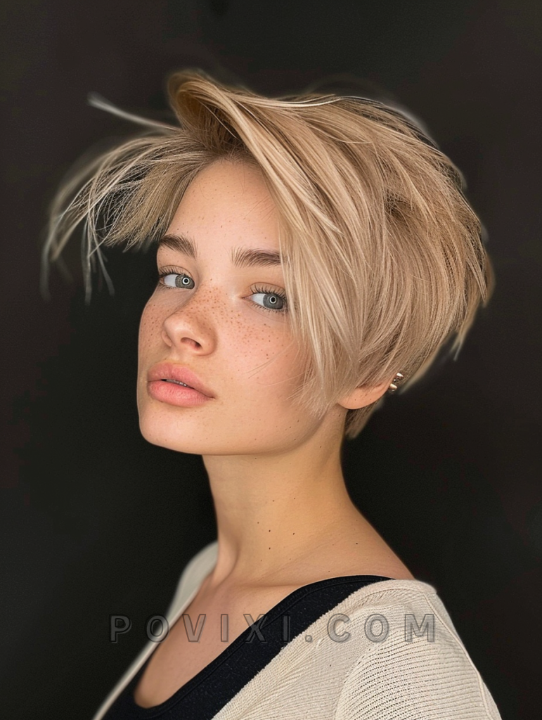 The sleek asymmetrical pixie with side-swept bangs is a polished and sophisticated option. This cut features a smooth finish with bangs that sweep elegantly to one side, creating a sleek and refined look. It’s ideal for round faces and oval faces, adding a touch of elegance and definition.