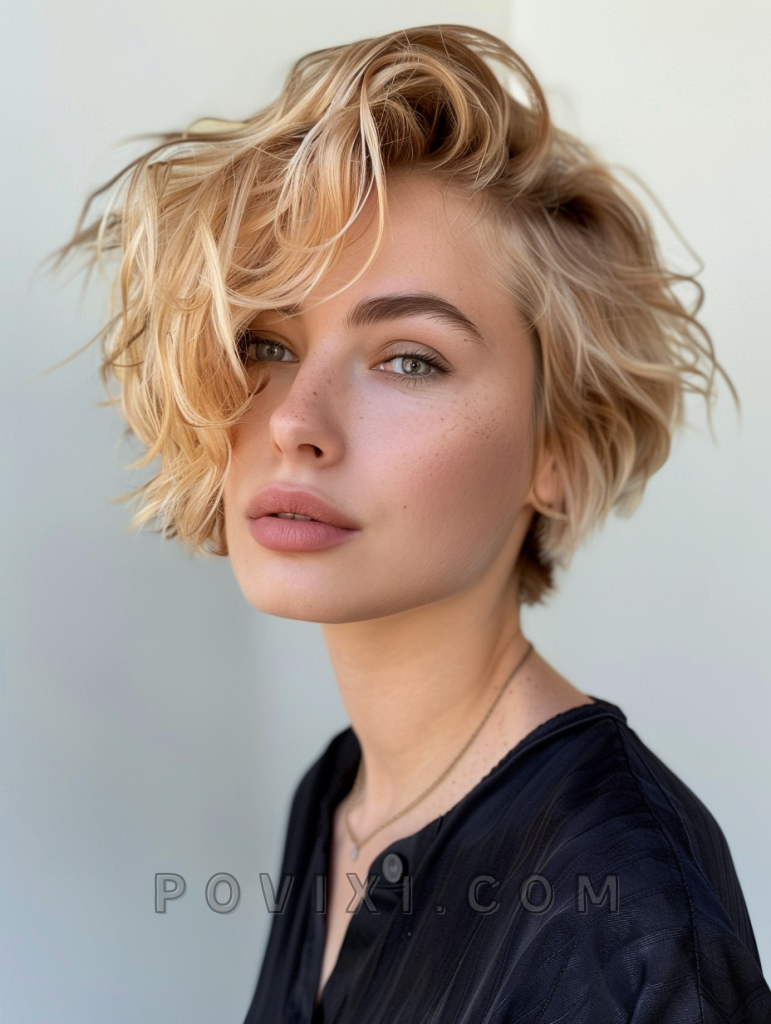 The wavy asymmetrical pixie is perfect for those who love the beachy, carefree look. This style features loose, tousled waves and an asymmetrical cut, creating a relaxed and effortless vibe. It’s ideal for round faces and oval faces, as the waves add a touch of softness and movement to the hair.