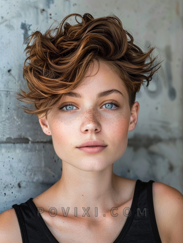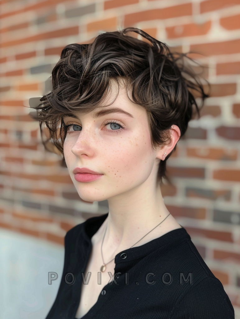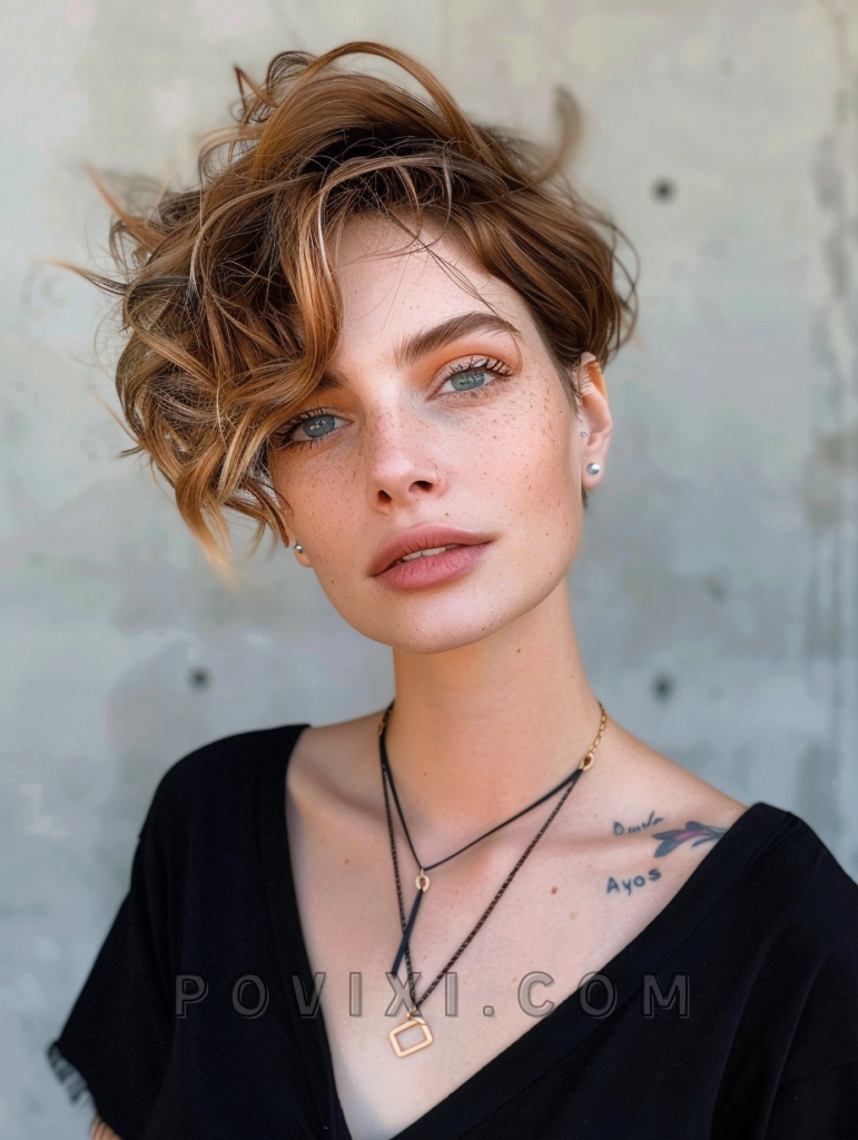 The asymmetrical pixie with soft curls is a romantic and feminine option that adds a touch of elegance to your look. This cut features soft, loose curls on one side, creating a chic and sophisticated appearance. It’s perfect for round faces and oval faces, adding a touch of softness and movement to the hair.
