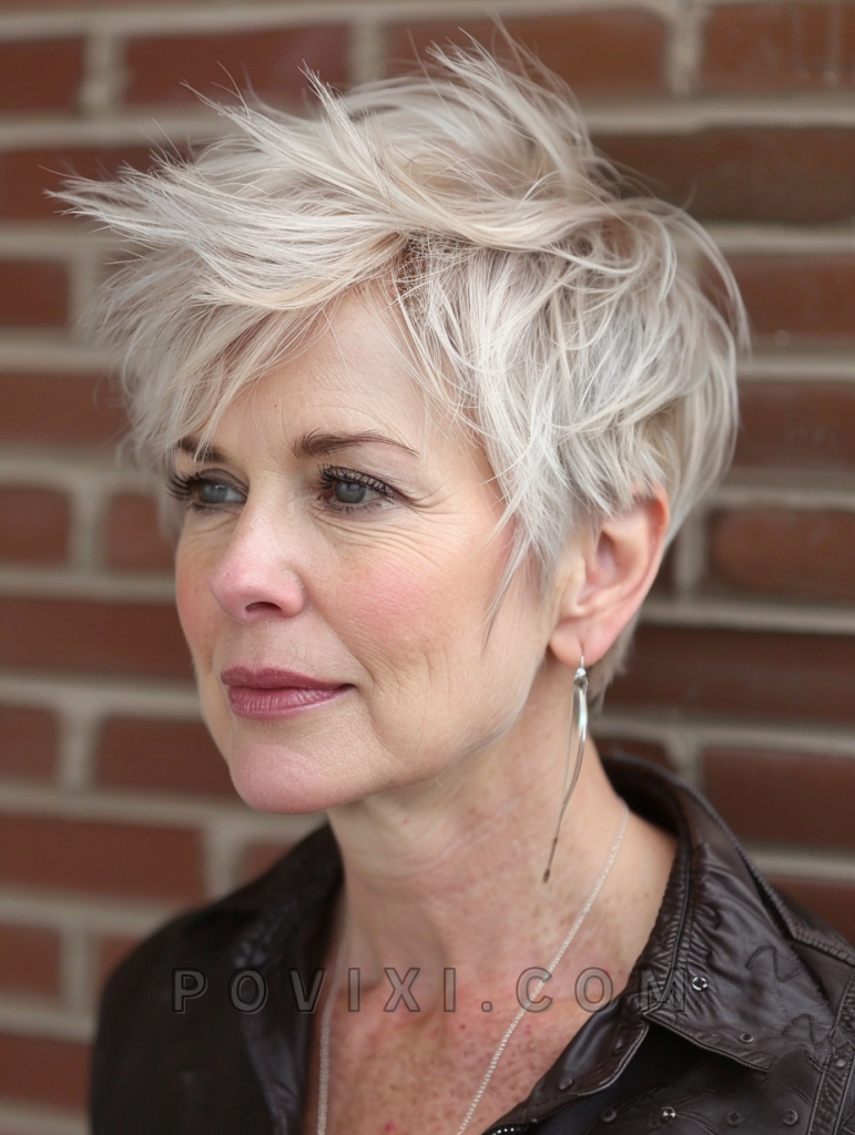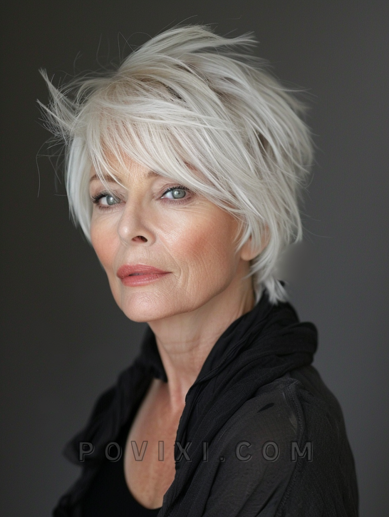 The asymmetrical pixie with long bangs is a great option for older women who want to embrace a modern and stylish look. This cut features long, sweeping bangs that add a touch of elegance and sophistication, while the asymmetry adds a contemporary edge. It’s perfect for round faces and oval faces, as it helps frame the face and highlight the cheekbones.