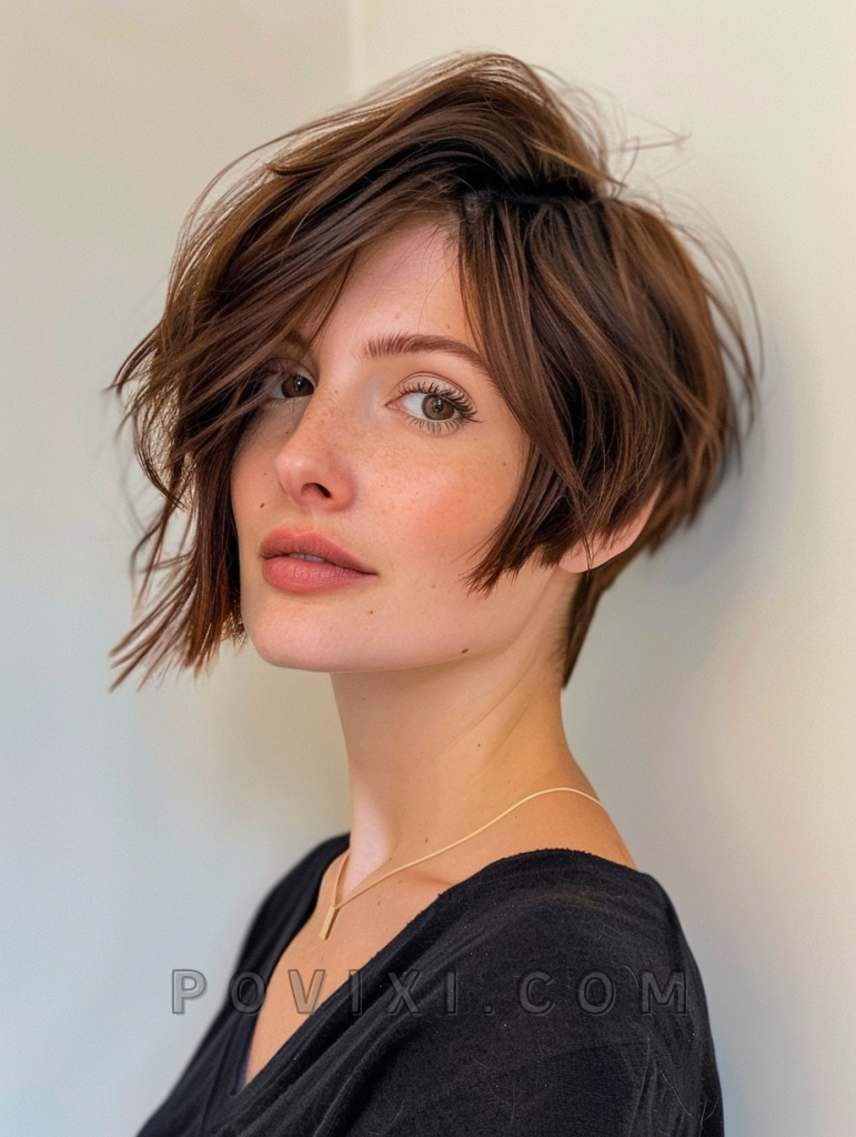The asymmetrical pixie bob is a classic style with a modern twist. This cut features a longer length on one side, creating a chic and elegant look. It’s perfect for round faces and oval faces, as it adds a touch of sophistication and helps frame the face beautifully.