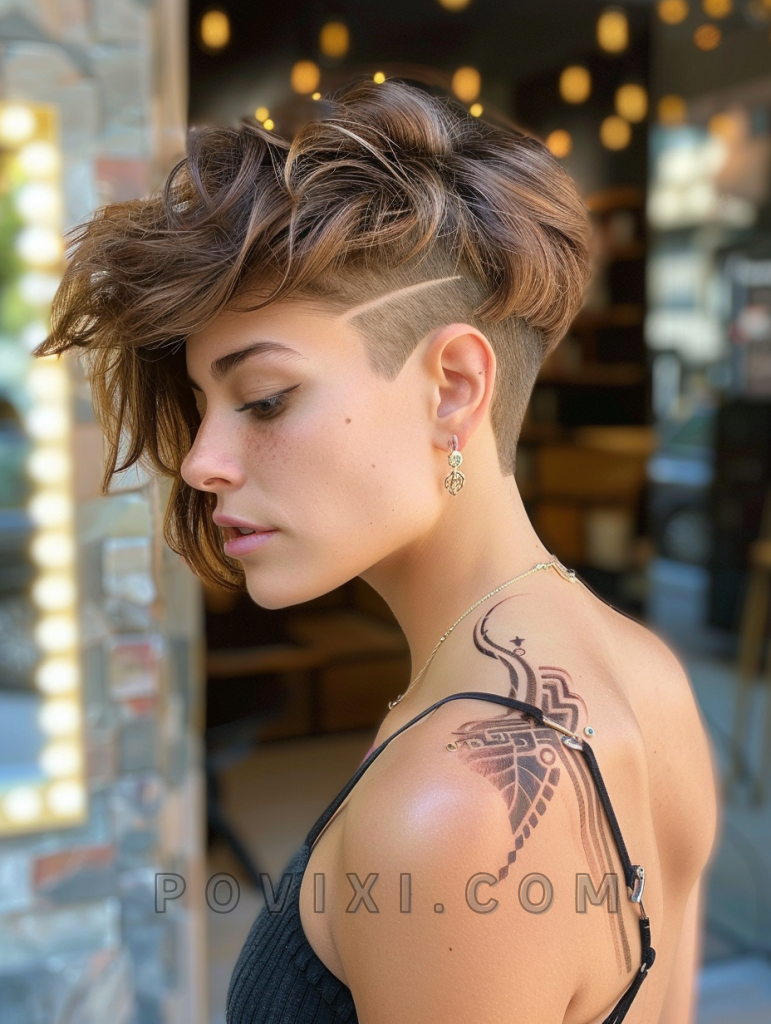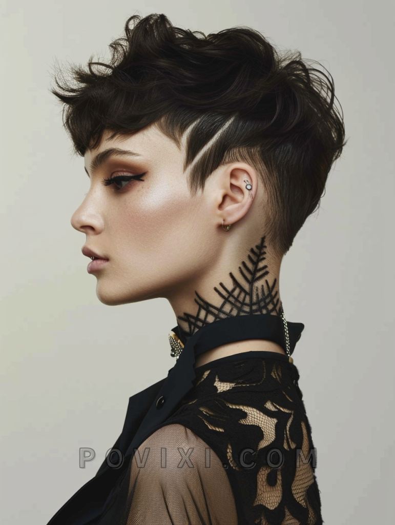 The asymmetrical pixie with shaved designs is a bold and creative option for those who want to make a statement. This cut features intricate shaved designs on one side, adding a unique and artistic touch to the asymmetrical shape. It’s perfect for round faces and heart-shaped faces, adding a modern and edgy twist to your look.