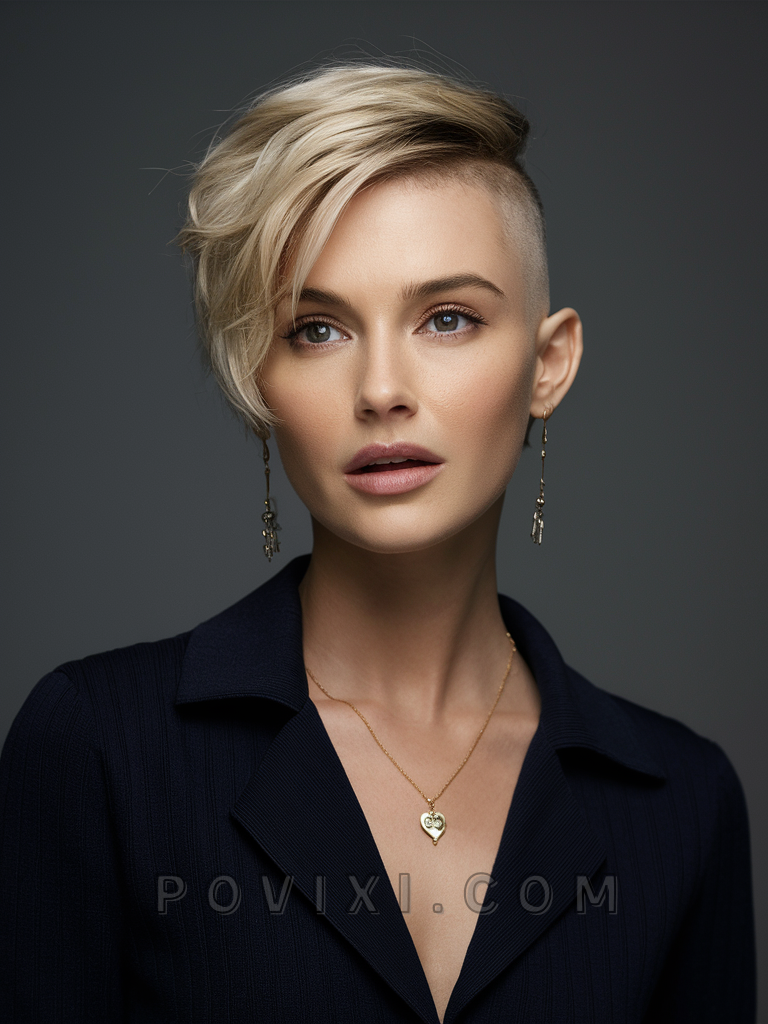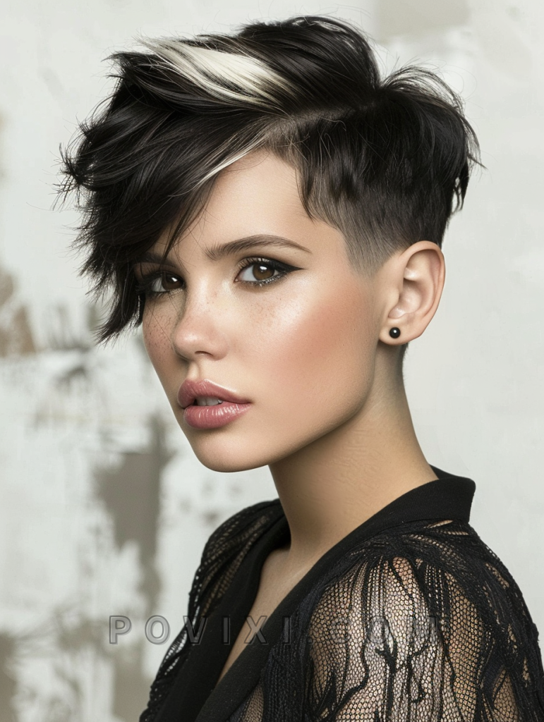 For those who want to make a bold statement, the buzzed asymmetrical pixie is the way to go. This cut features a closely-cropped or shaved section on one side, with the other side left longer for a dramatic contrast. It’s perfect for round faces and heart-shaped faces, as it adds a modern and edgy touch to your look.