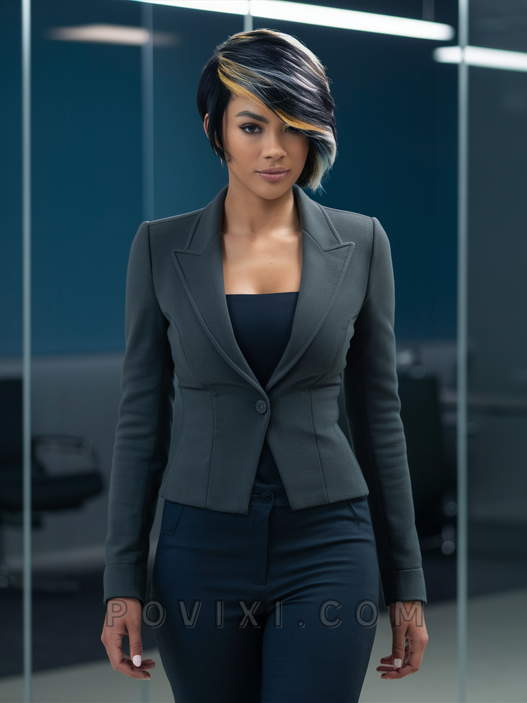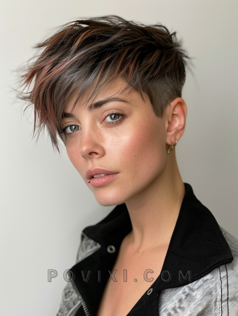 The asymmetrical pixie with metallic hues is a striking and modern option that adds a futuristic touch to your look. This cut features one side longer than the other, with metallic highlights adding dimension and shine. It’s ideal for round faces and oval faces, as it creates a dynamic and eye-catching appearance.
