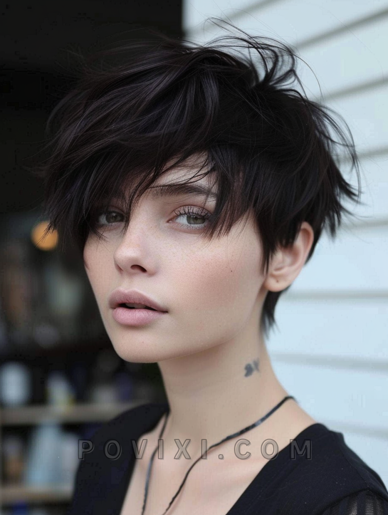 The asymmetrical pixie with layered bangs is a chic and contemporary option that adds texture and movement to your look. This cut features one side longer than the other, with layered bangs that frame the face beautifully. It’s perfect for round faces and heart-shaped faces, adding a touch of sophistication and style.