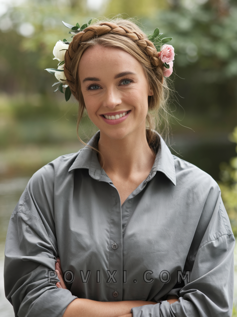 A braided crown adorned with flowers is a pretty and romantic choice, perfect for weddings or spring events. This style suits round and oval faces, adding softness and a feminine touch.