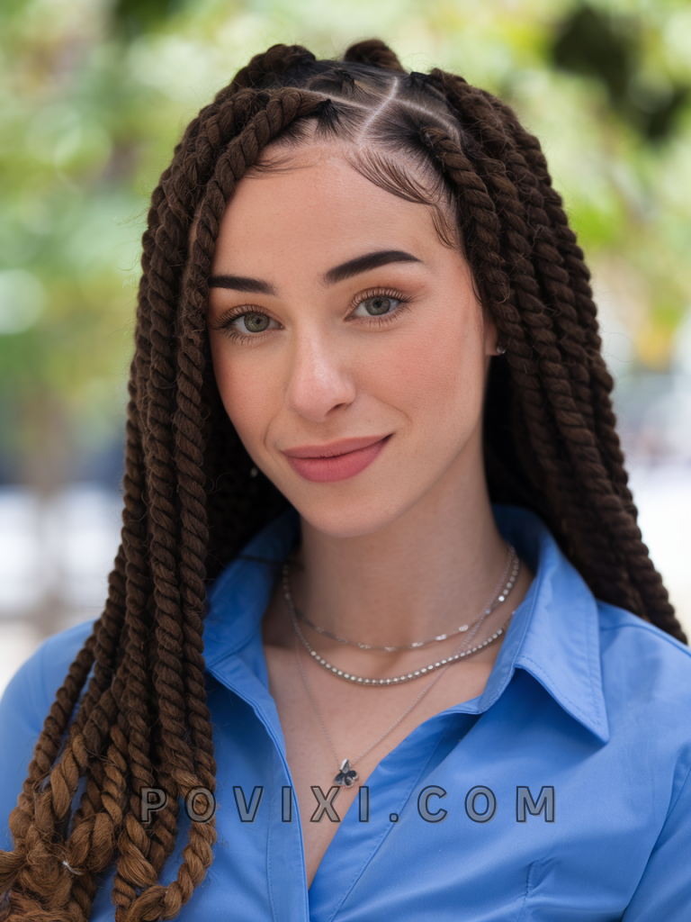 Rope twists, also known as two-strand twists, are a sleek and easy-to-maintain style. Suitable for natural hair and kids, these twists add a modern, chic vibe, perfect for casual outings or school. This style flatters all face shapes and is especially stunning on darker skin tones with warm eye colors.