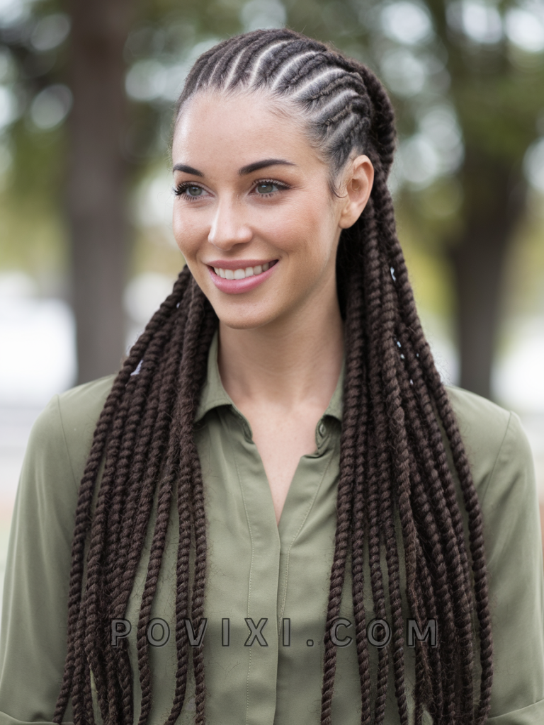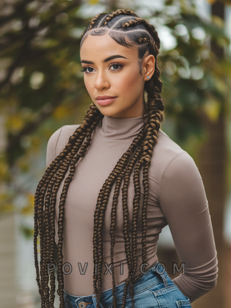 For the styling process, each braid is parted thicker than usual, and a pomade is applied to ensure a sleek look. Stylists use a larger comb to create defined sections, and braiding is done with care to avoid breakage. For maintenance, a daily scalp massage with nourishing oil can prevent dryness, and silk scarves or bonnets keep the braids intact overnight.