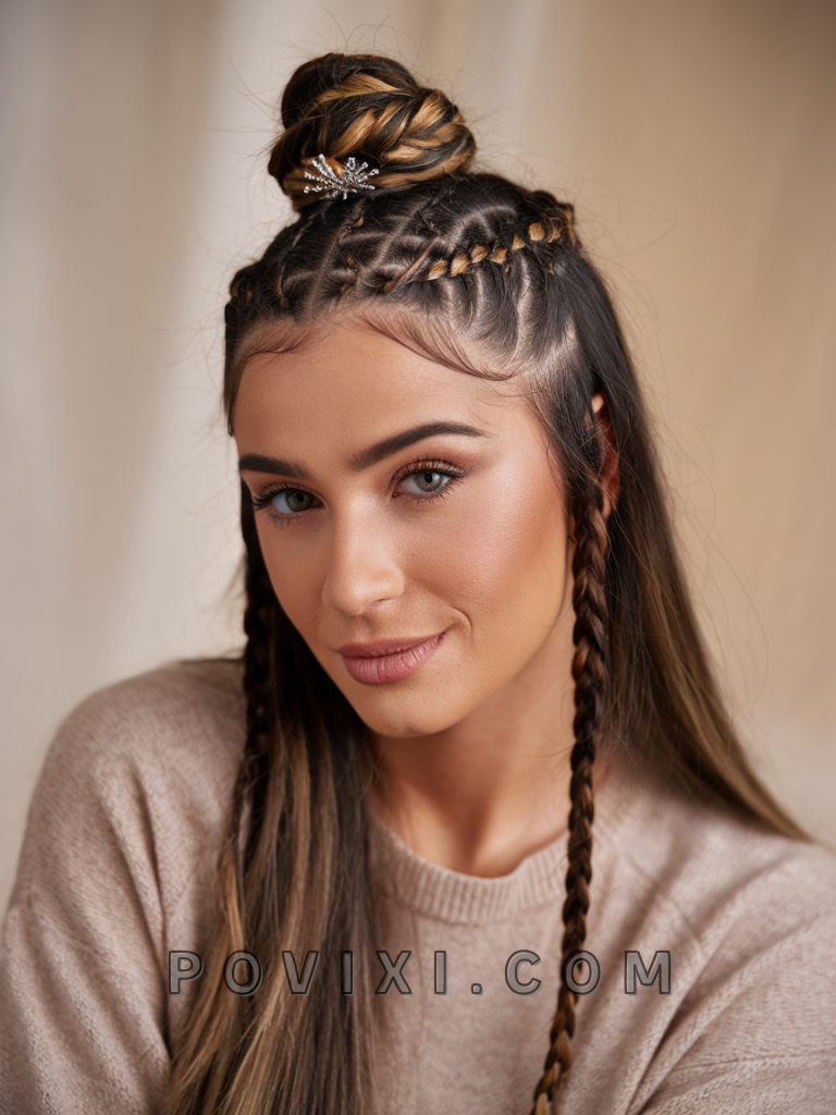 The style involves creating three small braids, which are then gathered into a bun. Stylists often use strong-hold gel to keep each braid in place. A light spritz of finishing spray maintains the bun’s shape, and a touch of hair oil adds a polished shine.