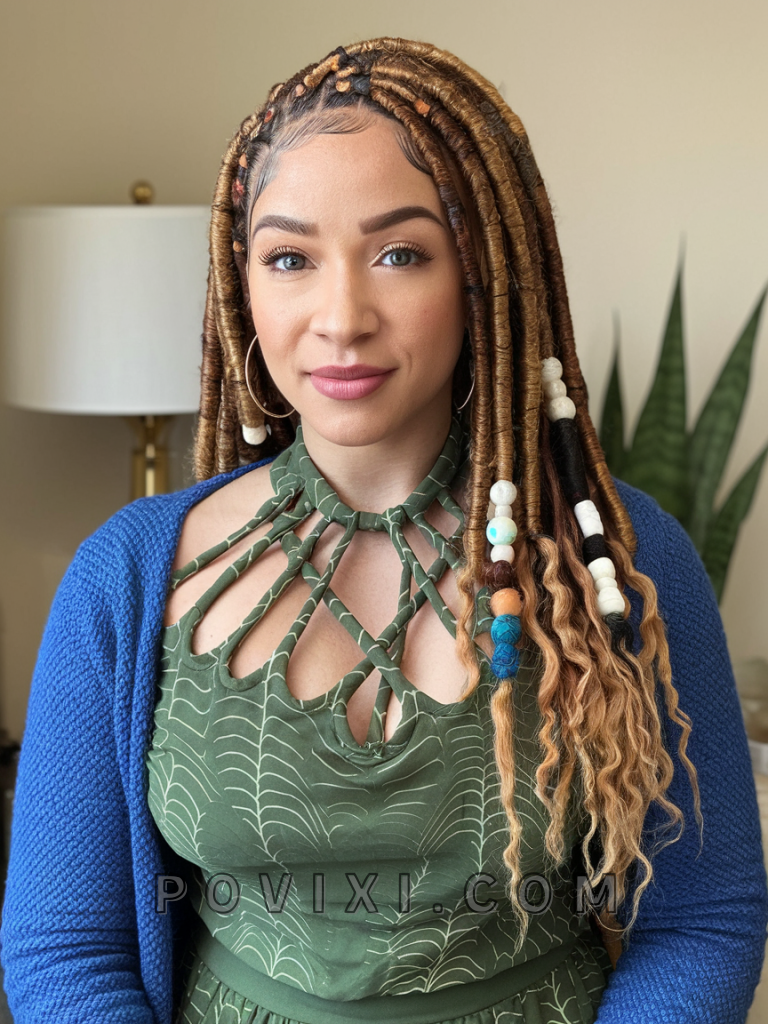 To create this style, locs are braided individually, and beads are threaded onto the ends or along the braid’s length. A lightweight oil keeps locs moisturized and shiny, while accessories can be swapped for a fresh look. Maintenance involves regular oil application and gentle handling to prevent bead loss.
