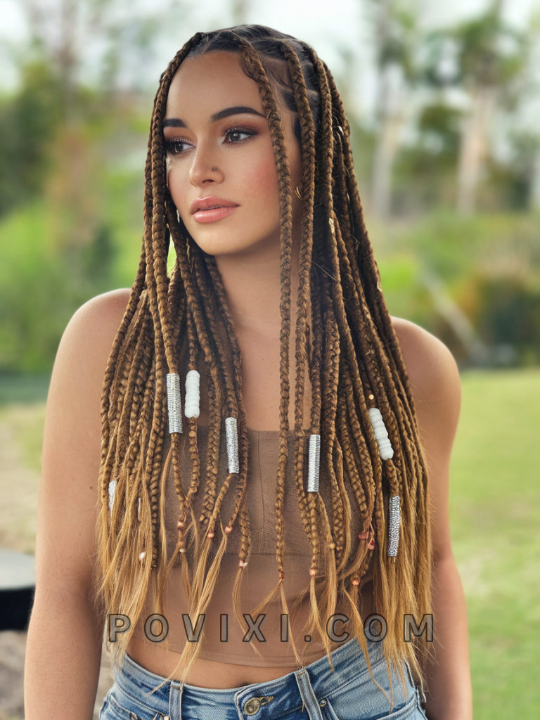 This style starts with loosely braided sections, and beads are added at the ends or along the braid length. To enhance volume, apply a volumizing spray before braiding. For upkeep, a light anti-frizz serum keeps the braids smooth and manageable.