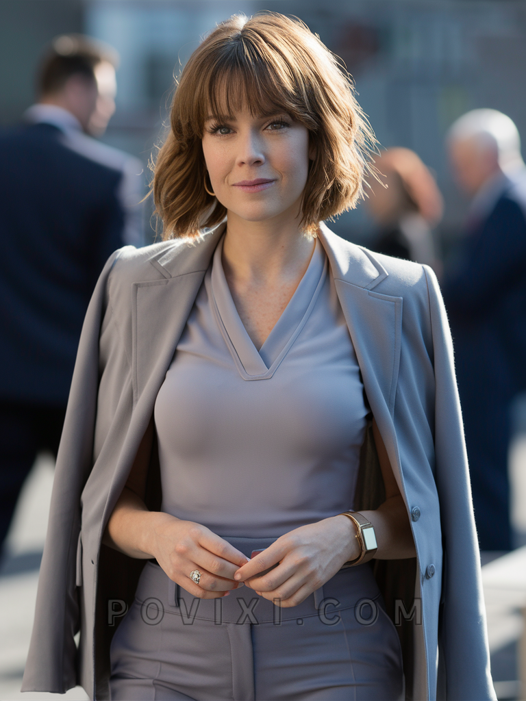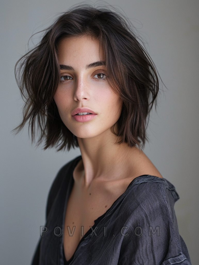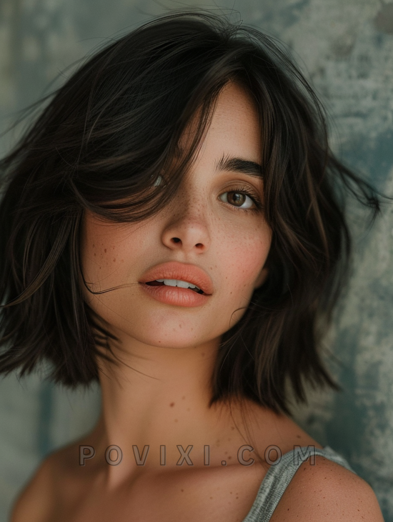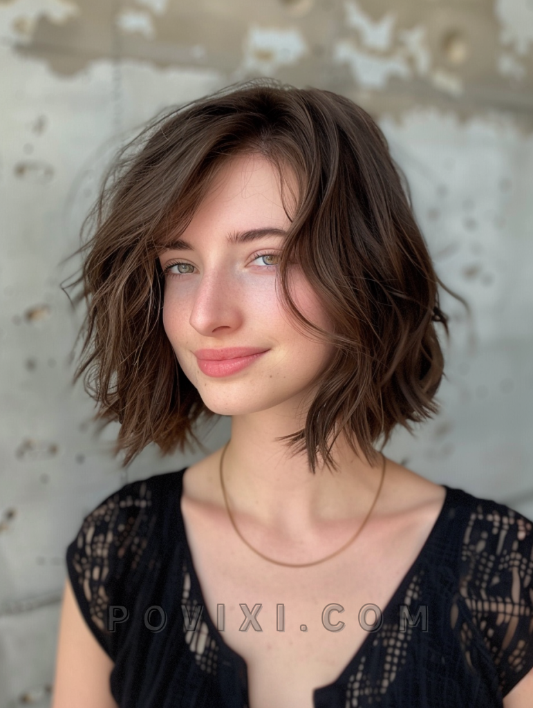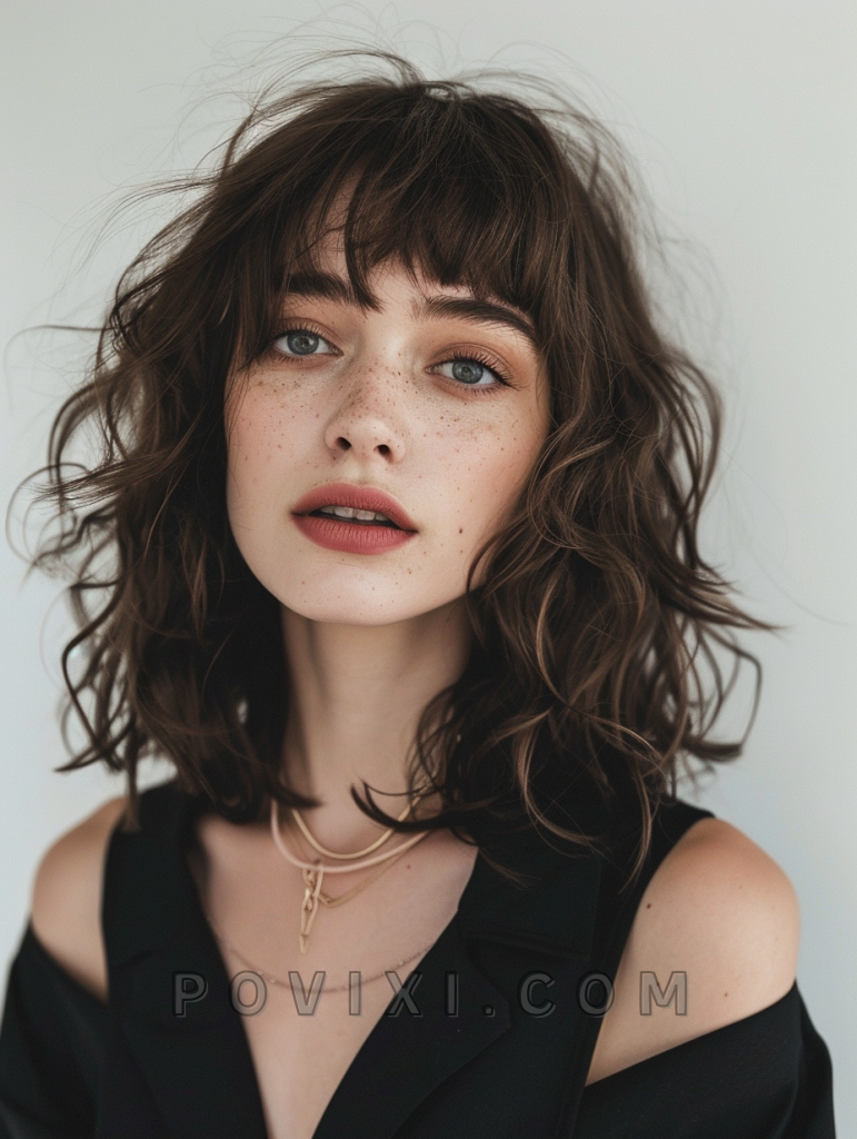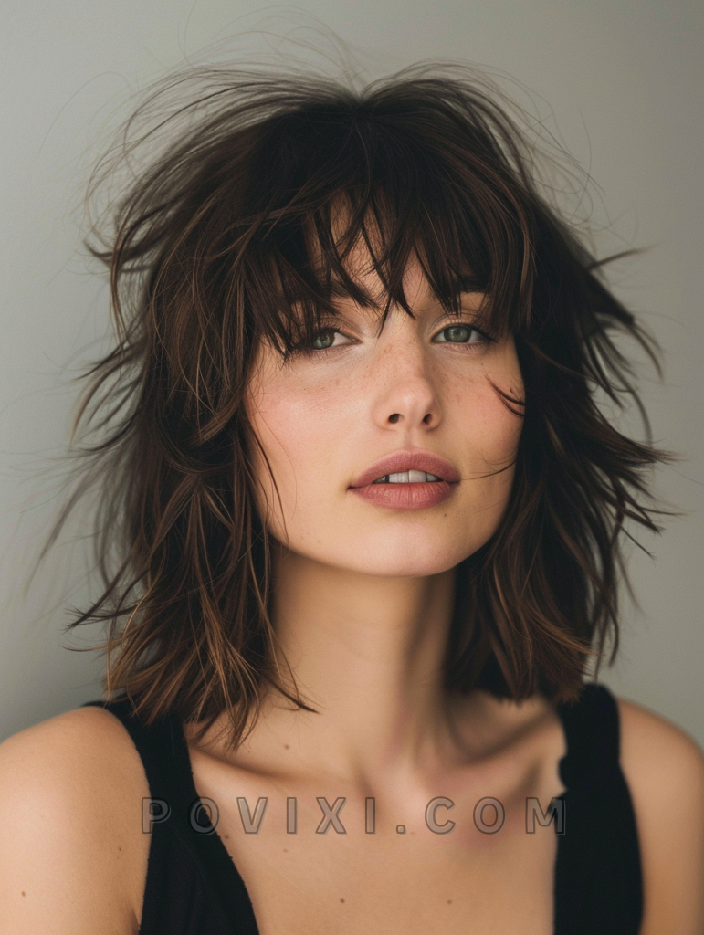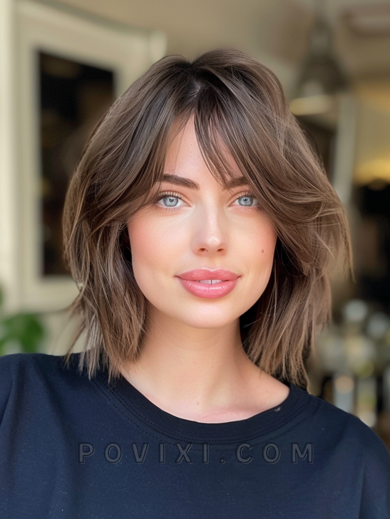 The messy lob with bangs is a relaxed and effortless style that exudes casual chic. This shoulder-length cut features tousled layers that add volume and movement, making it ideal for those with fine hair. The addition of bangs frames the face beautifully, making it a versatile option that suits most face shapes, especially oval and heart-shaped faces. This hairstyle is perfect for a day out with friends or a casual evening event.