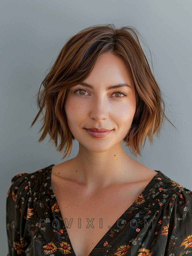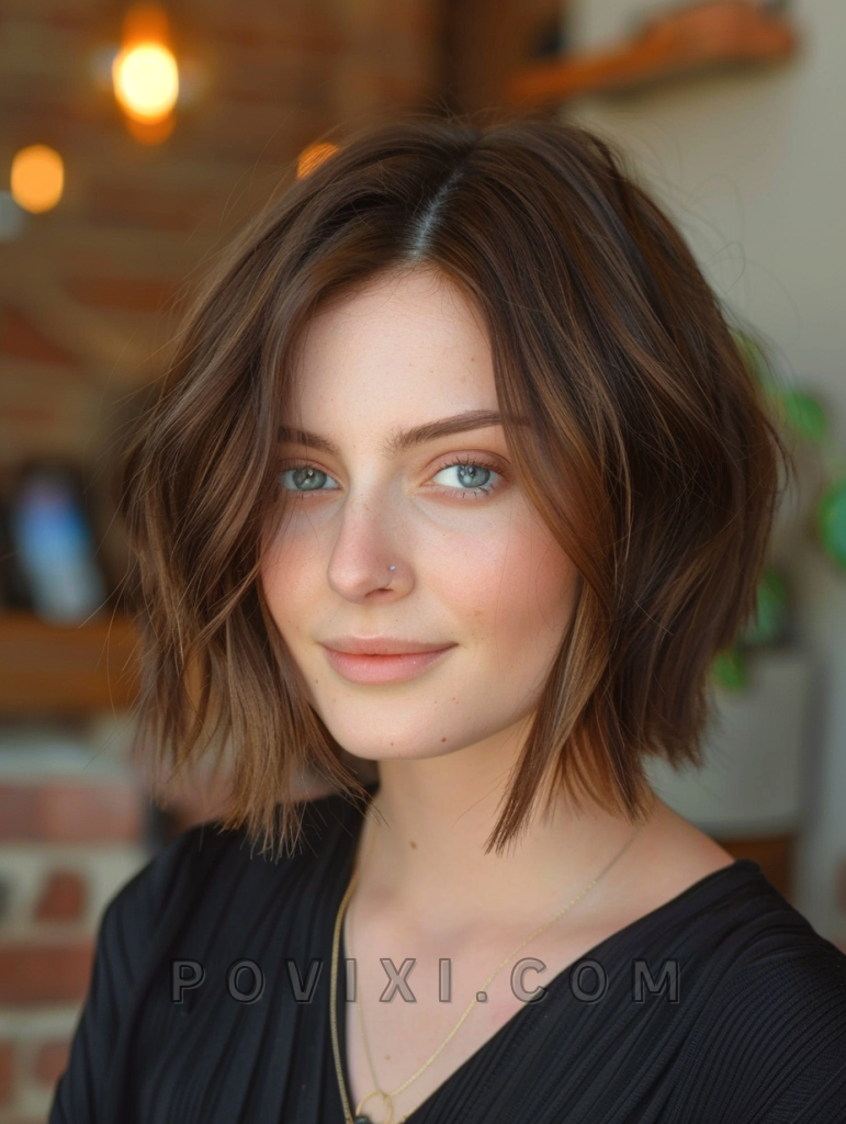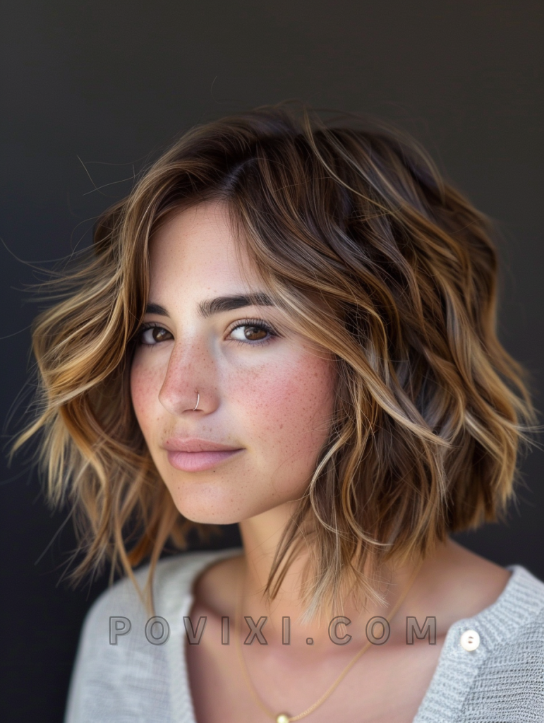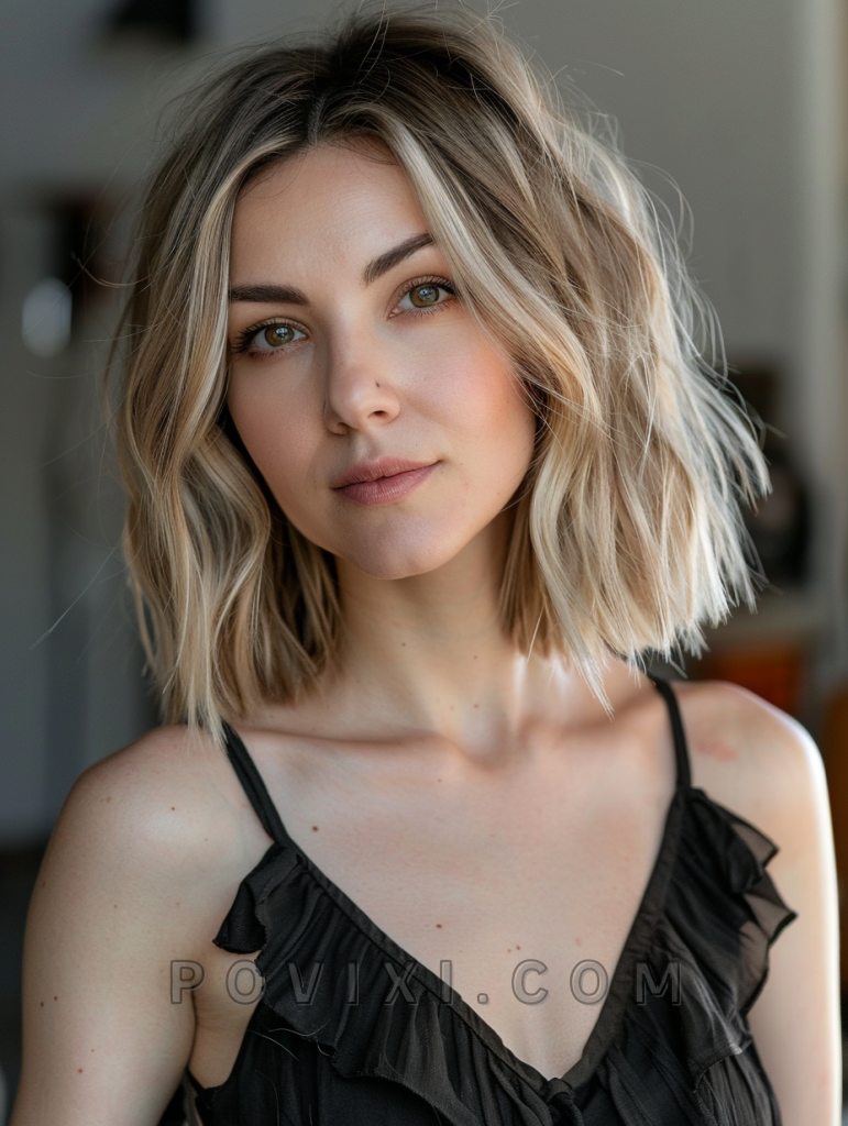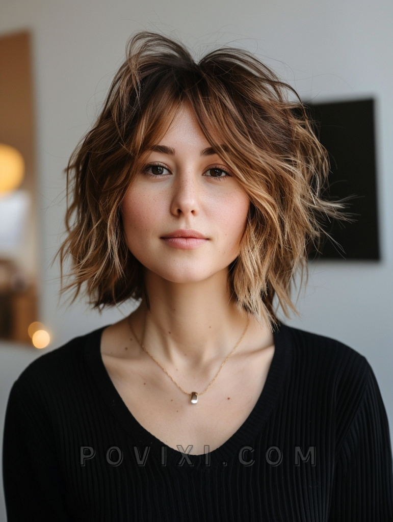 The textured choppy bob with highlights is a vibrant and dynamic hairstyle that adds depth and dimension to your look. This style features choppy layers with strategically placed highlights that create a sun-kissed effect. It’s a perfect choice for those with fine hair who want to add volume and movement. This hairstyle is great for summer events, beach outings, or casual get-togethers, and it suits most face shapes, particularly oval and heart-shaped faces.