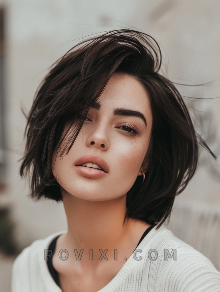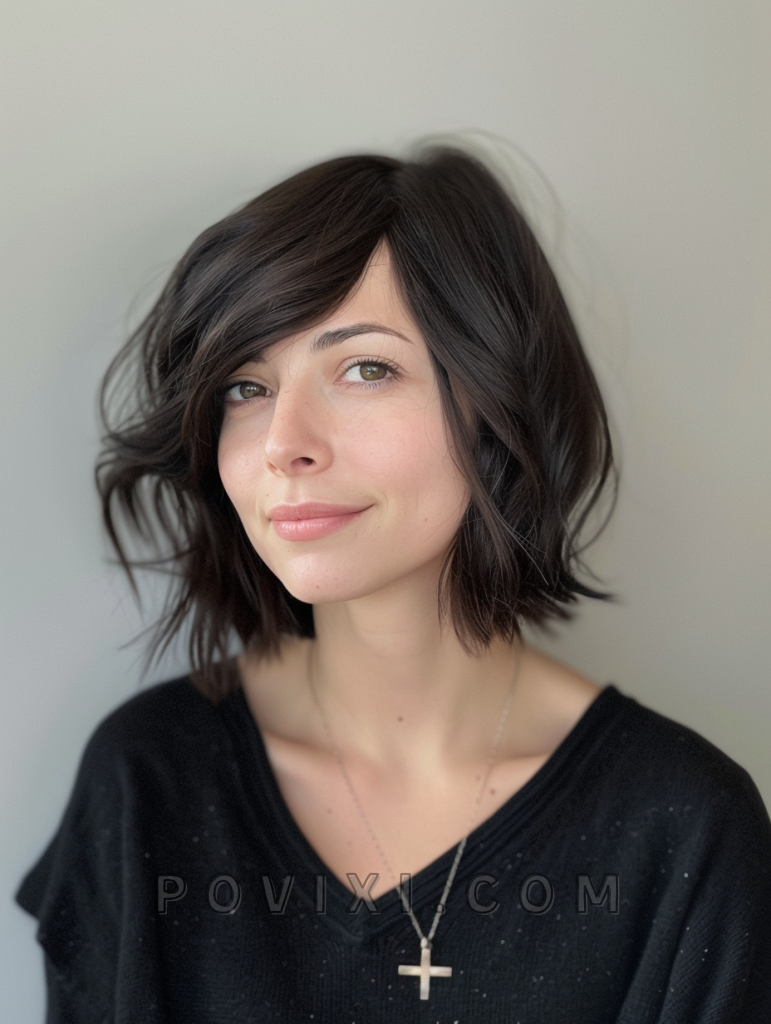 The choppy bob with side swept bangs is a chic and sophisticated style that adds a touch of elegance to your look. The side swept bangs frame the face beautifully, making it a great option for those with fine hair or thick hair. This style is perfect for both casual and formal occasions, offering a versatile look that suits most face shapes, especially oval and heart shapes.