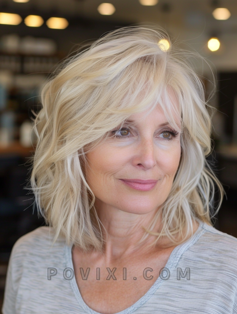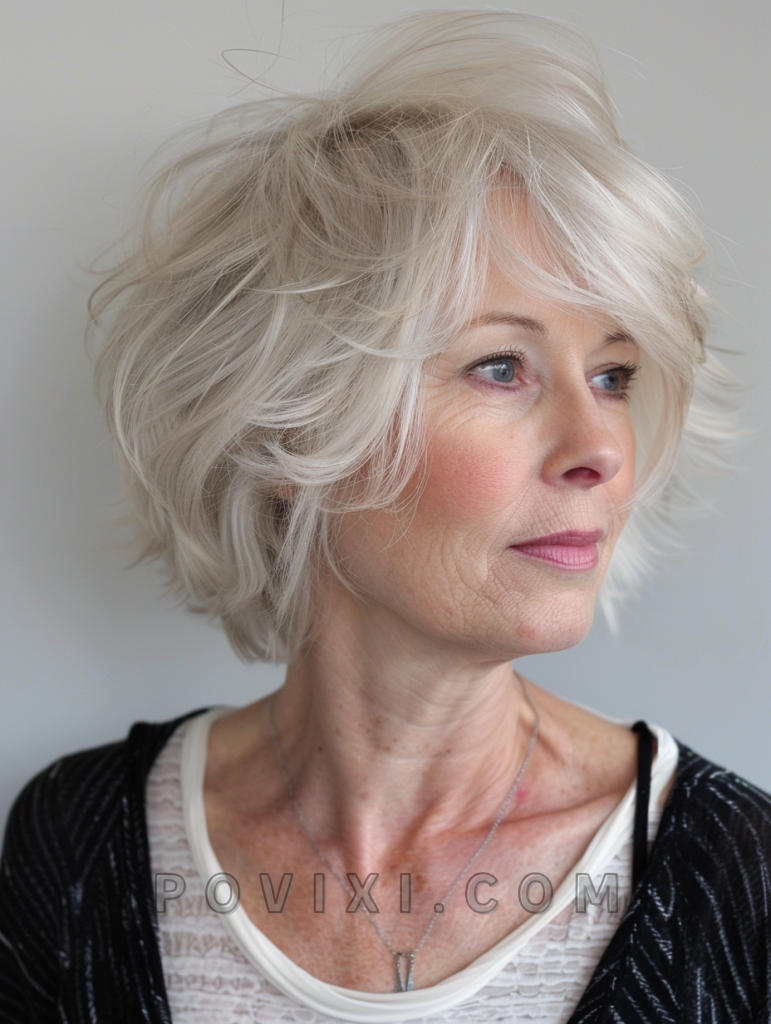The choppy bob for women over 60 is a stylish and youthful choice that adds volume and movement to aging hair. This cut is designed to enhance natural texture, making it a great option for those with thick hair or fine hair. The choppy layers soften the face and add a playful touch, making it perfect for any occasion, from casual outings to formal events.